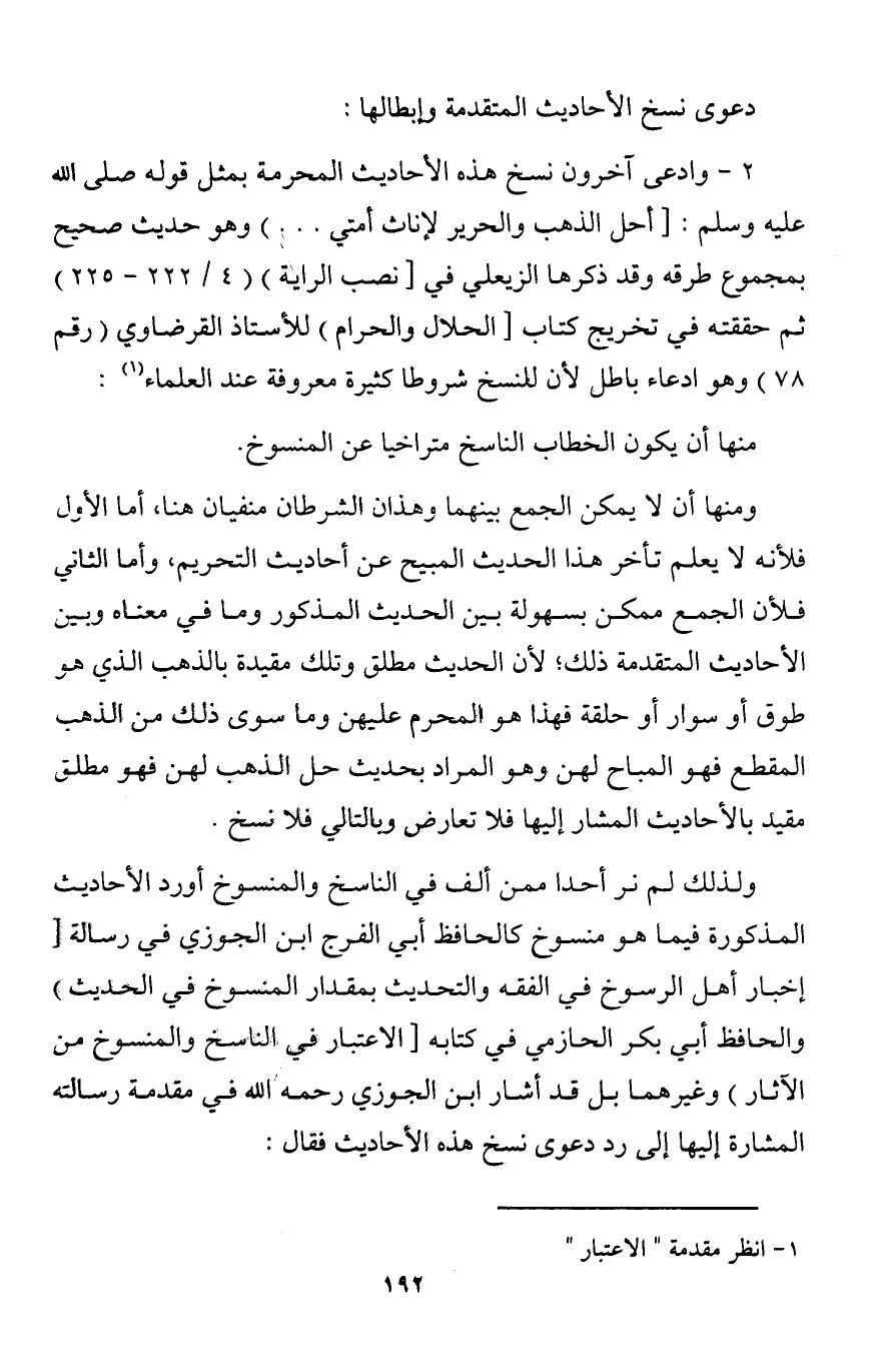 2 - وادعى آخرون نسخ هذه الأحاديث المحرمة بمثل قوله صلى الله عليه وسلم: [أحل الذهب والحرير لإناث أمتي. . .) وهو حديث صحيح بمجموع طرقه وقد ذكرها الزيعلي في [نصب الراية) (4/ 222 - 225) ثم حققته في تخريج كتاب [الحلال والحرام) للأستاذ القرضاوي (رقم 78) وهو ادعاء باطل لأن للنسخ شروطا كثيرة معروفة عند العلماء (¬1):
