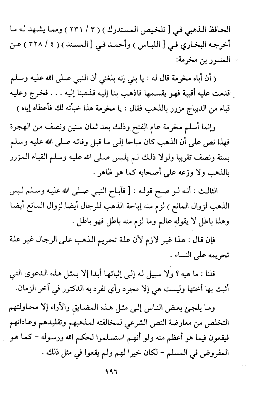 الثالث: أنه لو صح قوله: [فأباح النبي صلى الله عليه وسلم لبس الذهب لزوال المانع) لزم منه إباحة الذهب للرجال أيضا لزوال المانع أيضا وهذا باطل لا يقوله عالم وما لزم منه باطل فهو باطل.
