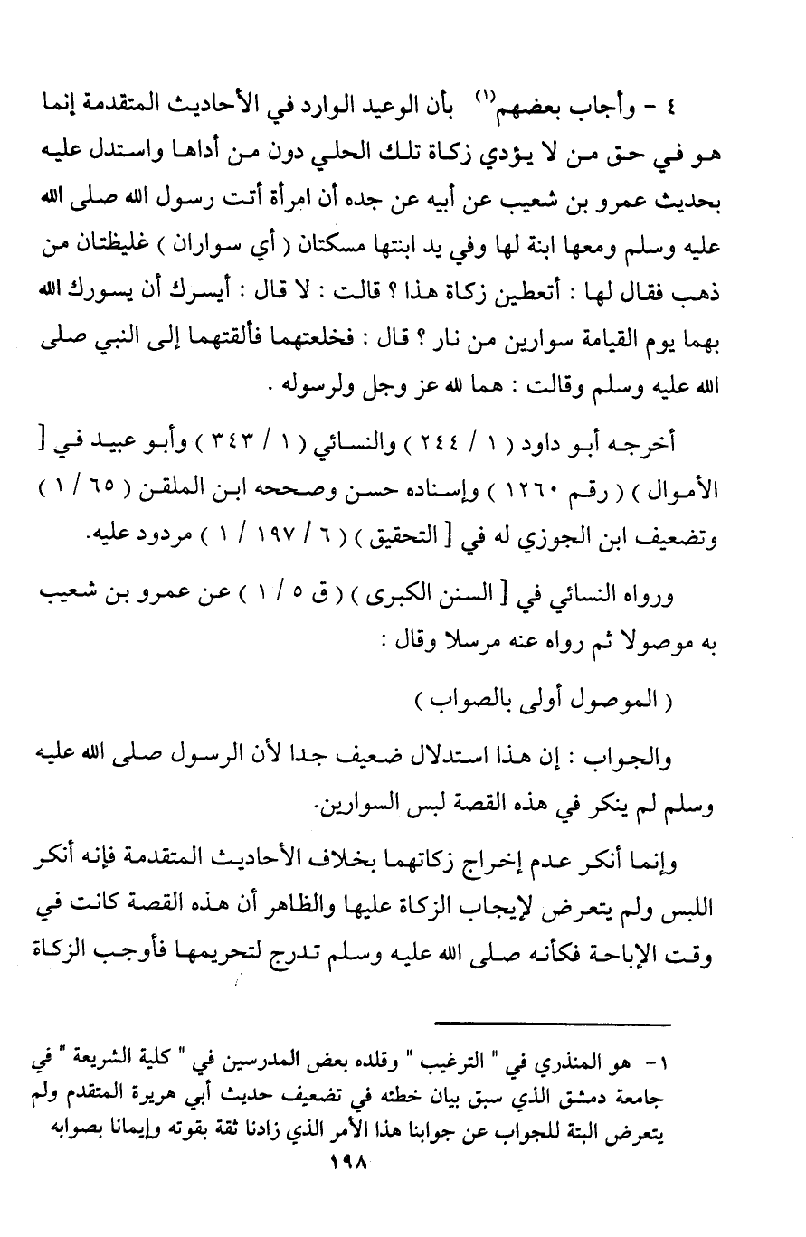 4 - وأجاب بعضهم (¬1) بأن الوعيد الوارد في الأحاديث المتقدمة إنما هو في حق من لا يؤدي زكاة تلك الحلي دون من أداها واستدل عليه بحديث عمرو بن شعيب عن أبيه عن جده أن امرأة أتت رسول الله صلى الله عليه وسلم ومعها ابنة لها وفي يد ابنتها مسكتان (أي سواران) غليظتان من ذهب فقال لها: أتعطين زكاة هذا؟ قالت: لا قال: أيسرك أن يسورك الله بهما يوم القيامة سوارين من نار؟ قال: فخلعتهما فألقتهما إلى النبي صلى الله عليه وسلم وقالت: هما لله عز وجل ولرسوله.