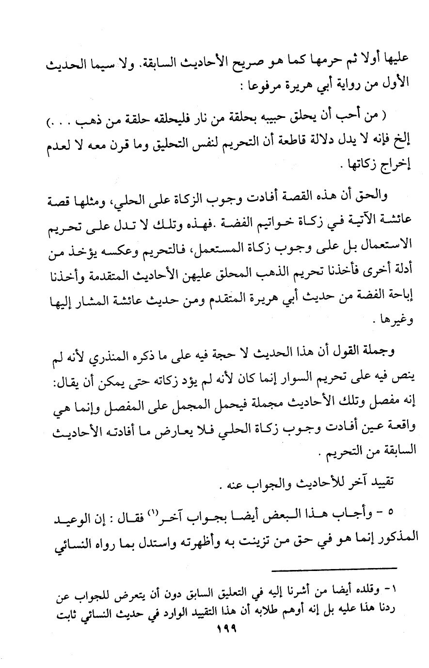 وجملة القول أن هذا الحديث لا حجة فيه على ما ذكره المنذري لأنه لم ينص فيه على تحريم السوار إنما كان لأنه لم يؤد زكاته حتى يمكن أن يقال: إنه مفصل وتلك الأحاديث مجملة فيحمل المجمل على المفصل وإنما هي واقعة عين أفادت وجوب زكاة الحلي فلا يعارض ما أفادته الأحاديث السابقة من التحريم.