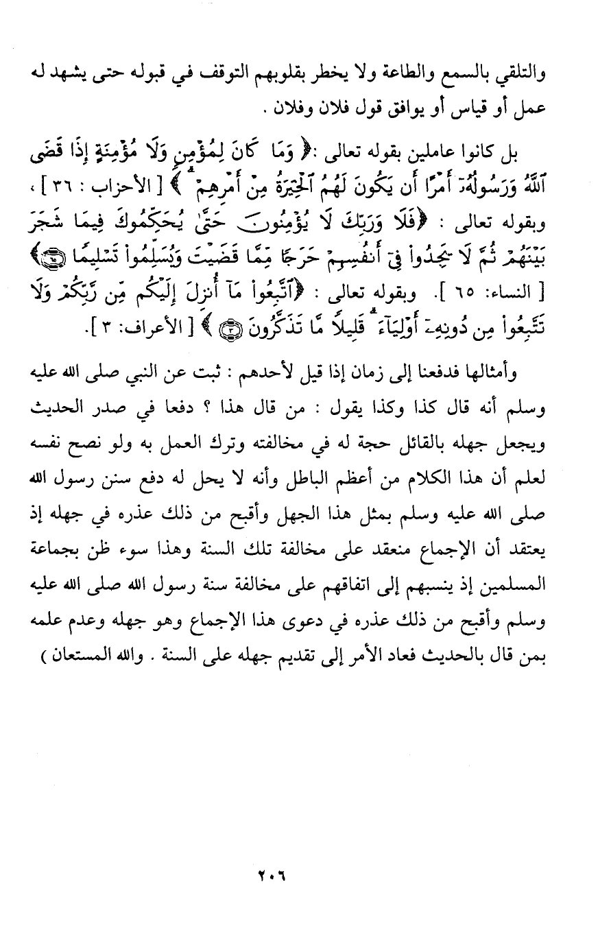 بل كانوا عاملين بقوله تعالى: {) وَمَا كَانَ لِمُؤْمِنٍ وَلا مُؤْمِنَةٍ إِذَا قَضَى اللَّهُ وَرَسُولُهُ أَمْراً أَنْ يَكُونَ لَهُمُ الْخِيَرَةُ مِنْ أَمْرِهِمْ} [الأحزاب: 36] , وبقوله تعالى: {) فَلا وَرَبِّكَ لا يُؤْمِنُونَ حَتَّى يُحَكِّمُوكَ فِيمَا شَجَرَ بَيْنَهُمْ ثُمَّ لا يَجِدُوا فِي أَنْفُسِهِمْ حَرَجاً مِمَّا قَضَيْتَ وَيُسَلِّمُوا تَسْلِيماً} [النساء: 65]. وبقوله تعالى: {) اتَّبِعُوا مَا أُنْزِلَ إِلَيْكُمْ مِنْ رَبِّكُمْ وَلا تَتَّبِعُوا مِنْ دُونِهِ أَوْلِيَاءَ قَلِيلاً مَا تَذَكَّرُونَ} [الأعراف: 3].