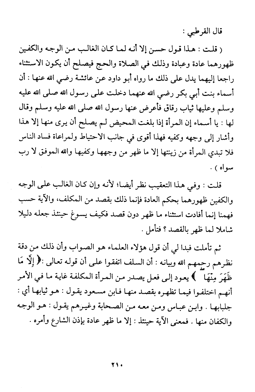 قلت: وفي هذا التعقيب نظر أيضا؛ لأنه وإن كان الغالب على الوجه والكفين ظهورهما بحكم العادة فإنما ذلك بقصد من المكلف, والآية حسب فهمنا إنما أفادت استثناء ما ظهر دون قصد فكيف يسوغ حينئذ جعله دليلا شاملا لما ظهر بالقصد؟ فتأمل.