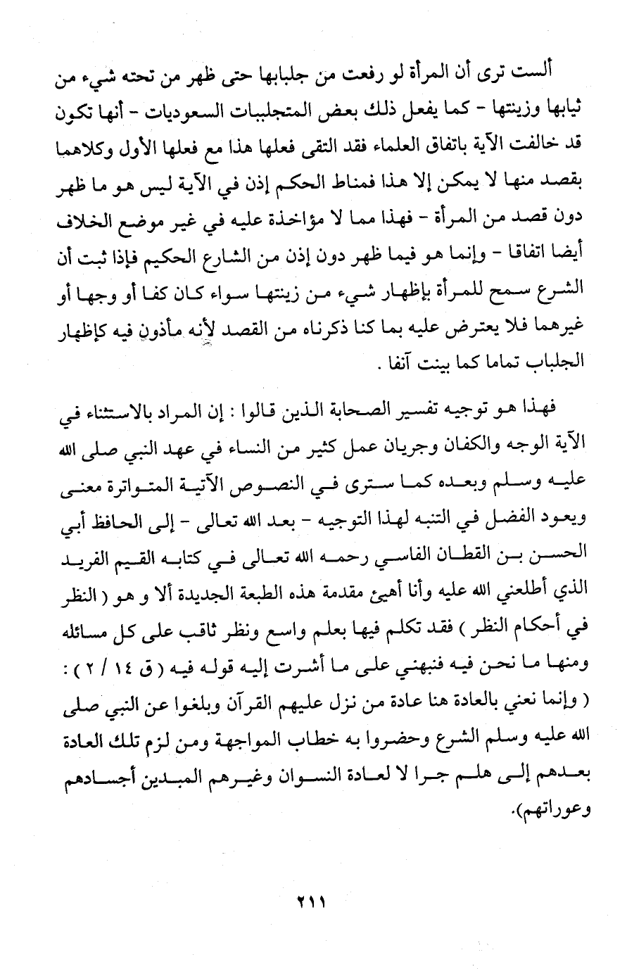 فهذا هو توجيه تفسير الصحابة الذين قالوا: إن المراد بالاستثناء في الآية الوجه والكفان وجريان عمل كثير من النساء في عهد النبي صلى الله عليه وسلم وبعده كما سترى في النصوص الآتية المتواترة معنى. ويعود الفضل في التنبه لهذا التوجيه - بعد الله تعالى - إلى الحافظ أبي الحسن بن القطان الفاسي رحمه الله تعالى في كتابه القيم الفريد الذي أطلعني الله عليه وأنا أهيئ مقدمة هذه الطبعة الجديدة ألا وهو (النظر في أحكام النظر) فقد تكلم فيها بعلم واسع ونظر ثاقب على كل مسائله ومنها ما نحن فيه فنبهني على ما أشرت إليه قوله فيه (ق 14/ 2):