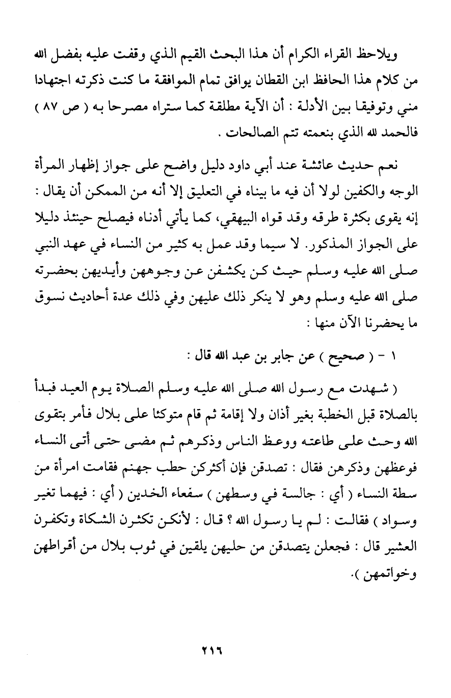 (شهدت مع رسول الله صلى الله عليه وسلم الصلاة يوم العيد فبدأ بالصلاة قبل الخطبة بغير أذان ولا إقامة ثم قام متوكئا على بلال فأمر بتقوى الله وحث على طاعته ووعظ الناس وذكرهم ثم مضى حتى أتى النساء فوعظهن وذكرهن فقال: تصدقن فإن أكثركن حطب جهنم فقامت امرأة من سطة النساء (أي: جالسة في وسطهن) سفعاء الخدين (أي: فيهما تغير وسواد) فقالت: لم يا رسول الله؟ قال: لأنكن تكثرن الشكاة وتكفرن العشير قال: فجعلن يتصدقن من حليهن يلقين في ثوب بلال من أقراطهن وخواتمهن).