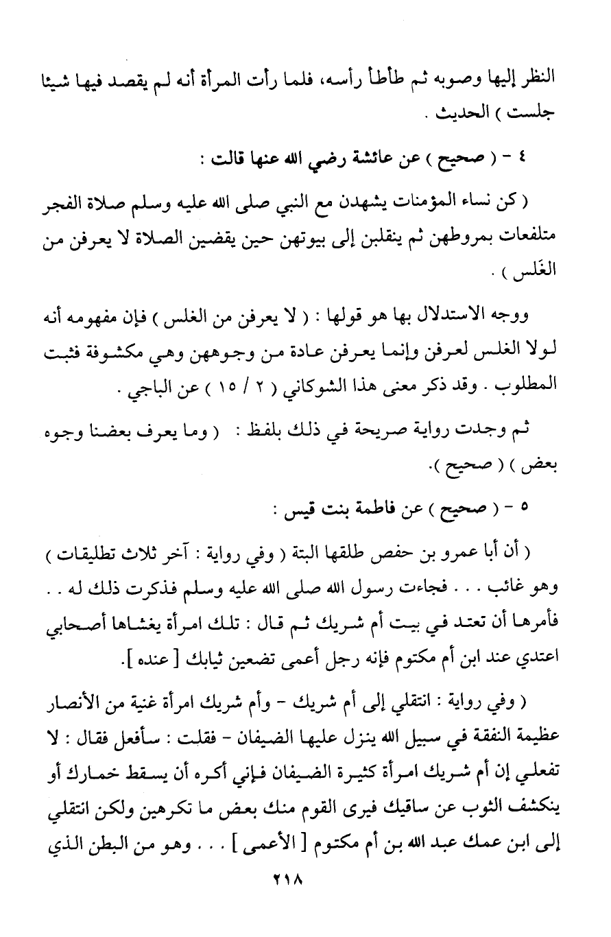 (كن نساء المؤمنات يشهدن مع النبي صلى الله عليه وسلم صلاة الفجر متلفعات بمروطهن ثم ينقلبن إلى بيوتهن حين يقضين الصلاة لا يعرفن من الغَلس).