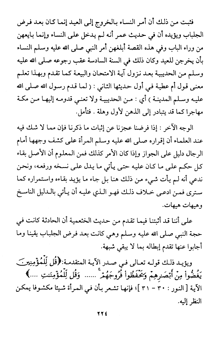 على أننا قد أثبتنا فيما تقدم من حديث الخثعمية أن الحادثة كانت في حجة النبي صلى الله عليه وسلم وهي كانت بعد فرض الجلباب يقينا وما أجابوا عنها تقدم إبطاله بما لا يبقي شبهة.