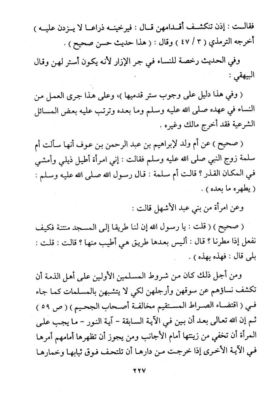 ومن أجل ذلك كان من شروط المسلمين الأولين على أهل الذمة أن تكشف نساؤهم عن سوقهن وأرجلهن لكي لا يتشبهن بالمسلمات كما جاء في (اقتضاء الصراط المستقيم مخالفة أصحاب الجحيم) (ص 59)