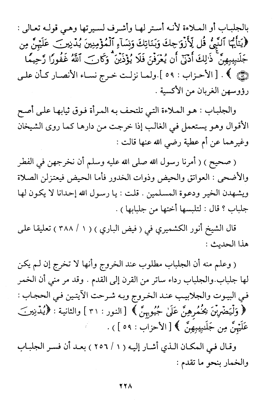 (وعلم منه أن الجلباب مطلوب عند الخروج وأنها لا تخرج إن لم يكن لها جلباب. والجلباب رداء ساتر من القرن إلى القدم. وقد مر مني أن الخمر في البيوت والجلابيب عند الخروج وبه شرحت الآيتين في الحجاب: {وَلْيَضْرِبْنَ بِخُمُرِهِنَّ عَلَى جُيُوبِهِنَّ} [النور: 31] والثانية: {يُدْنِينَ عَلَيْهِنَّ مِنْ جَلابِيبِهِنَّ} [الأحزاب: 59])