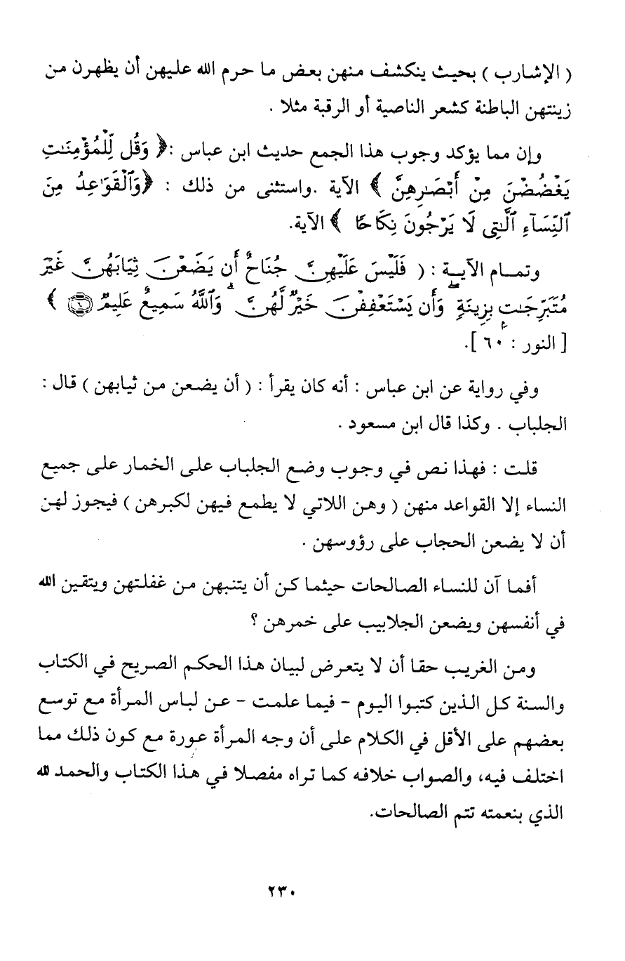قلت: فهذا نص في وجوب وضع الجلباب على الخمار على جميع النساء إلا القواعد منهن (وهن اللاتي لا يطمع فيهن لكبرهن) فيجوز لهن أن لا يضعن الحجاب على رؤوسهن.