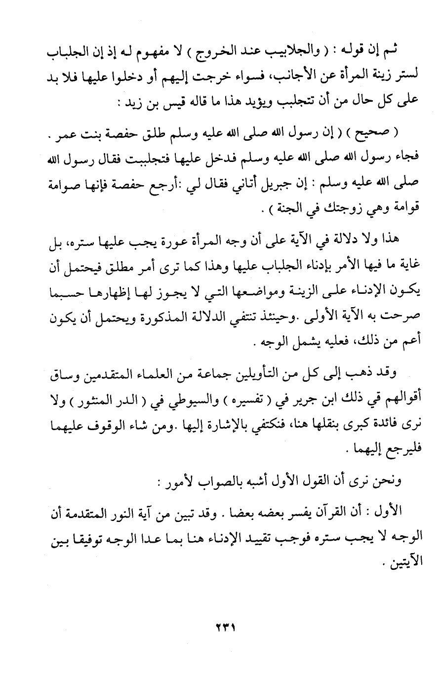 هذا ولا دلالة في الآية على أن وجه المرأة عورة يجب عليها ستره, بل غاية ما فيها الأمر بإدناء الجلباب عليها وهذا كما ترى أمر مطلق فيحتمل أن يكون الإدناء على الزينة ومواضعها التي لا يجوز لها إظهارها حسبما صرحت به الآية الأولى. وحينئذ تنتفي الدلالة المذكورة ويحتمل أن يكون أعم من ذلك, فعليه يشمل الوجه.