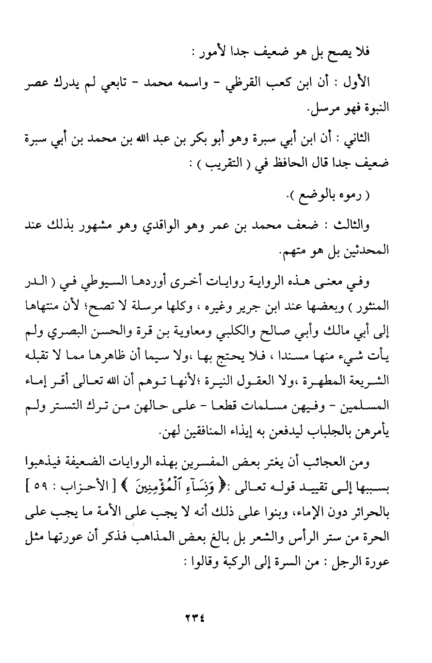 ومن العجائب أن يغتر بعض المفسرين بهذه الروايات الضعيفة فيذهبوا بسببها إلى تقييد قوله تعالى: {وَنِسَاءِ الْمُؤْمِنِينَ} [الأحزاب: 59] بالحرائر دون الإماء, وبنوا على ذلك أنه لا يجب على الأمة ما يجب على الحرة من ستر الرأس والشعر بل بالغ بعض المذاهب فذكر أن عورتها مثل عورة الرجل: من السرة إلى الركبة وقالوا: