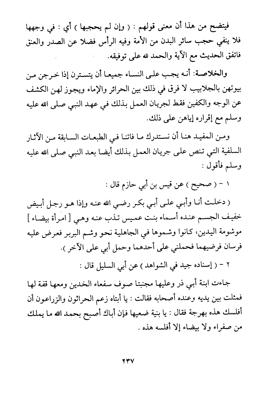 فيتضح من هذا أن معنى قولهم: (وإن لم يحجبها) أي: في وجهها فلا ينفي حجب سائر البدن من الأمة وفيه الرأس فضلا عن الصدر والعنق فاتفق الحديث مع الآية والحمد لله على توفيقه.