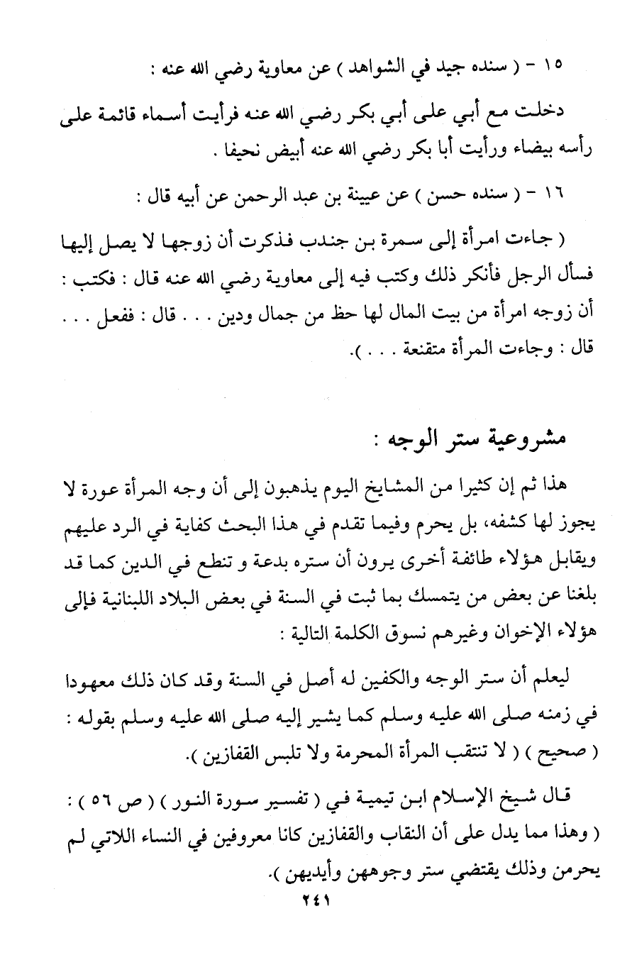 (وهذا مما يدل على أن النقاب والقفازين كانا معروفين في النساء اللاتي لم يحرمن وذلك يقتضي ستر وجوههن وأيديهن).