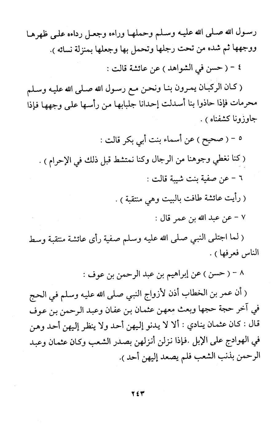 (أن عمر بن الخطاب أذن لأزواج النبي صلى الله عليه وسلم في الحج في آخر حجة حجها وبعث معهن عثمان بن عفان وعبد الرحمن بن عوف قال: كان عثمان ينادي: ألا لا يدنو إليهن أحد ولا ينظر إليهن أحد وهن في الهوادج على الإبل. فإذا نزلن أنزلهن بصدر الشعب وكان عثمان وعبد الرحمن بذنب الشعب فلم يصعد إليهن أحد).
