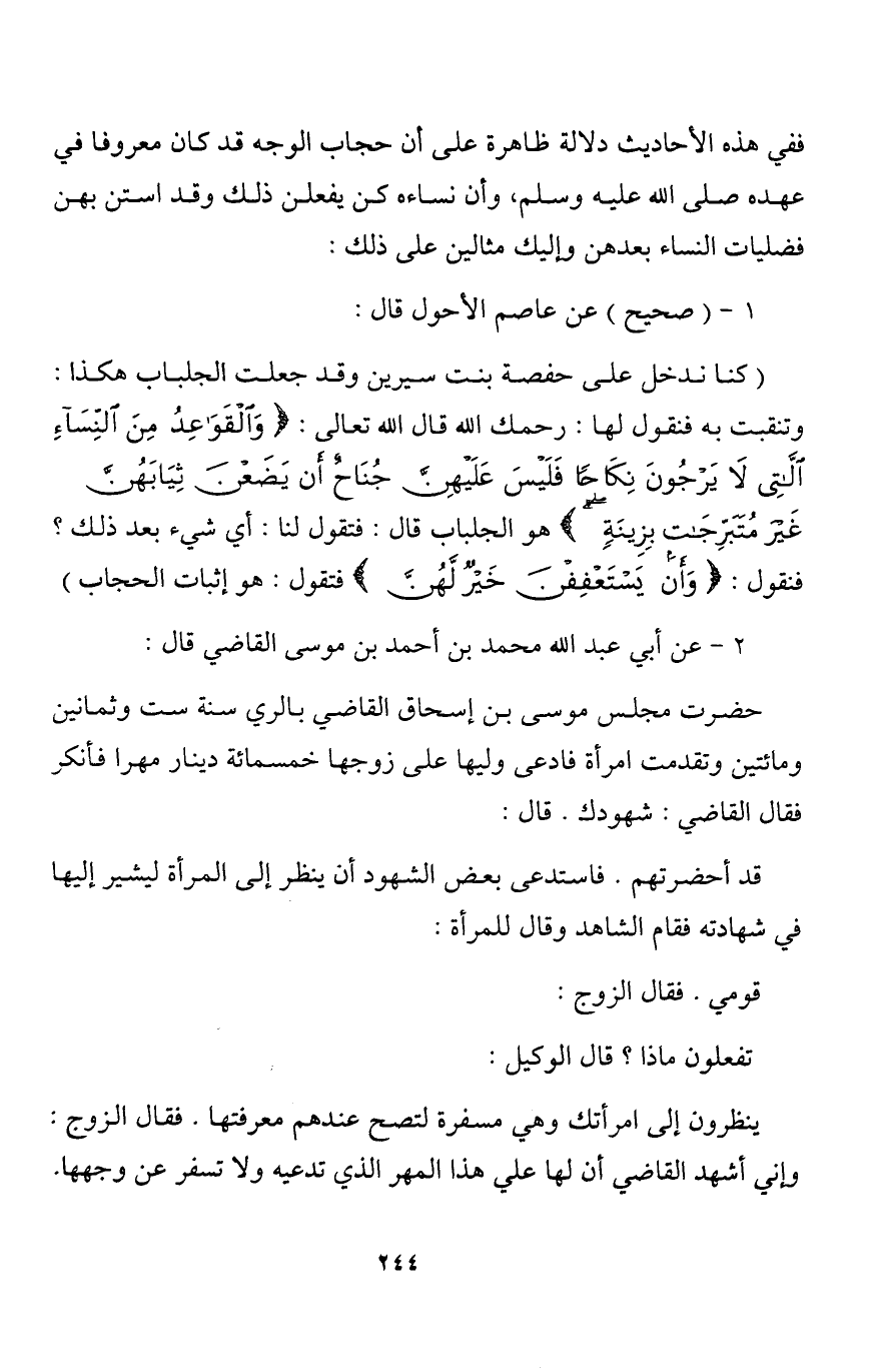 (كنا ندخل على حفصة بنت سيرين وقد جعلت الجلباب هكذا: وتنقبت به فنقول لها: رحمك الله قال الله تعالى: {وَالْقَوَاعِدُ مِنَ النِّسَاءِ اللَّاتِي لا يَرْجُونَ نِكَاحاً فَلَيْسَ عَلَيْهِنَّ جُنَاحٌ أَنْ يَضَعْنَ ثِيَابَهُنَّ غَيْرَ مُتَبَرِّجَاتٍ بِزِينَةٍ} هو الجلباب قال: فتقول لنا: أي شيء بعد ذلك؟ فنقول: {وَأَنْ يَسْتَعْفِفْنَ خَيْرٌ لَهُنَّ} فتقول: هو إثبات الحجاب).