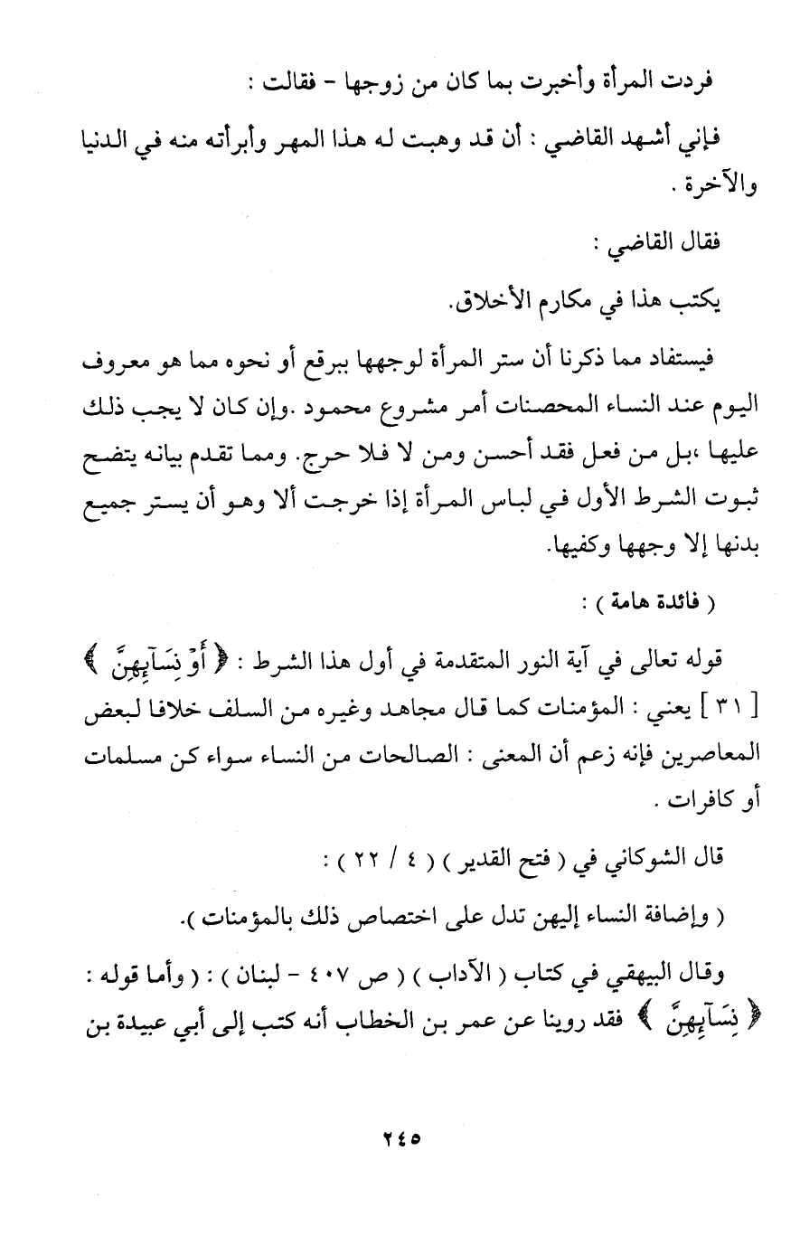 وقال البيهقي في كتاب (الآداب) (ص 407 - لبنان): (وأما قوله: {نِسَائِهِنَّ} فقد روينا عن عمر بن الخطاب أنه كتب إلى أبي عبيدة بن