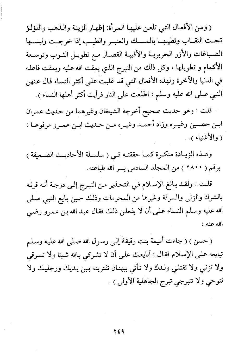 قلت: ولقد بالغ الإسلام في التحذير من التبرج إلى درجة أنه قرنه بالشرك والزنى والسرقة وغيرها من المحرمات وذلك حين بايع النبي صلى الله عليه وسلم النساء على أن لا يفعلن ذلك فقال عبد الله بن عمرو رضي الله عنه: