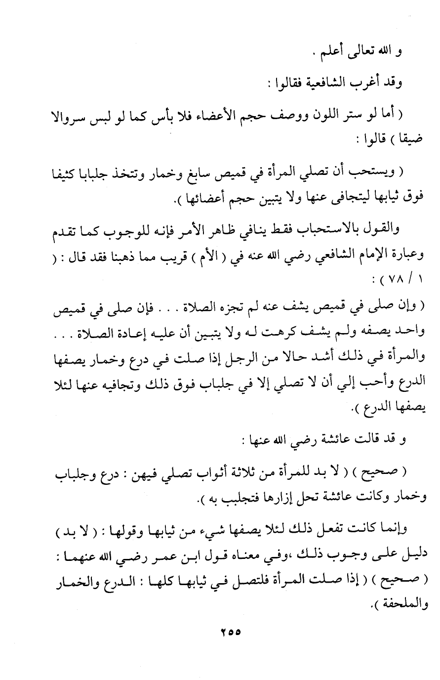 والقول بالاستحباب فقط ينافي ظاهر الأمر فإنه للوجوب كما تقدم وعبارة الإمام الشافعي رضي الله عنه في (الأم) قريب مما ذهبنا فقد قال: (1/ 78): (وإن صلى في قميص يشف عنه لم تجزه الصلاة. . . فإن صلى في قميص واحد يصفه ولم يشف كرهت له ولا يتبين أن عليه إعادة الصلاة. . . والمرأة في ذلك أشد حالا من الرجل إذا صلت في درع وخمار يصفها الدرع وأحب إلي أن لا تصلي إلا في جلباب فوق ذلك وتجافيه عنها لئلا يصفها الدرع).
