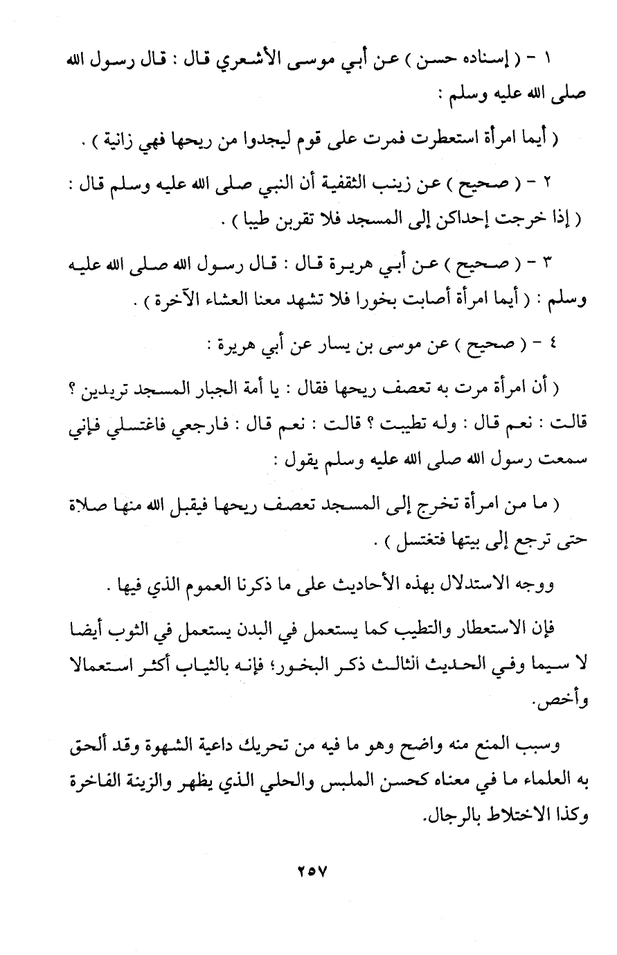 3 - (صحيح) عن أبي هريرة قال: قال رسول الله صلى الله عليه وسلم: (أيما امرأة أصابت بخورا فلا تشهد معنا العشاء الآخرة).