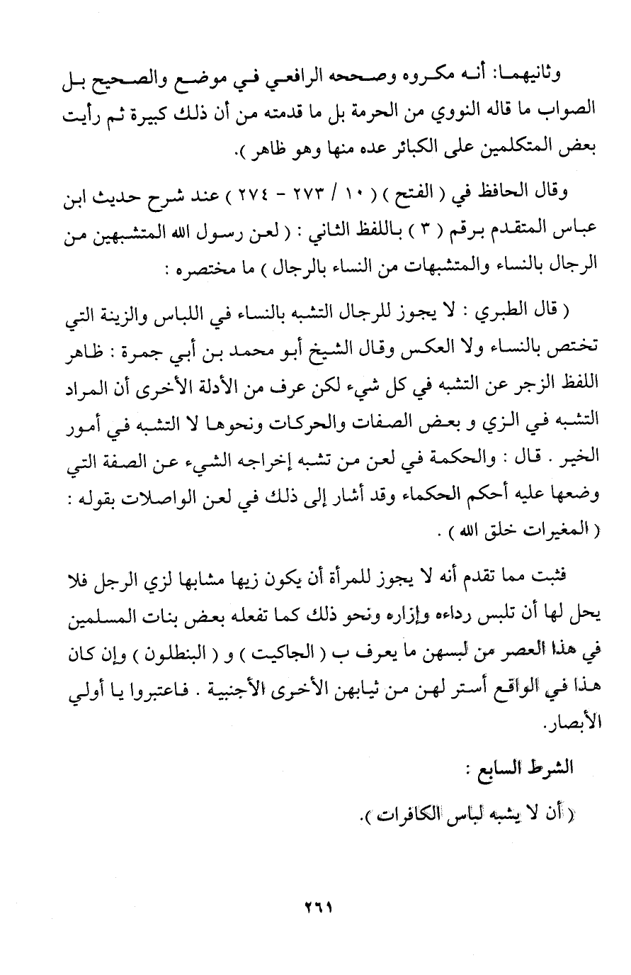 وقال الحافظ في (الفتح) (10/ 273 - 274) عند شرح حديث ابن عباس المتقدم برقم (3) باللفظ الثاني: (لعن رسول الله المتشبهين من الرجال بالنساء والمتشبهات من النساء بالرجال) ما مختصره: