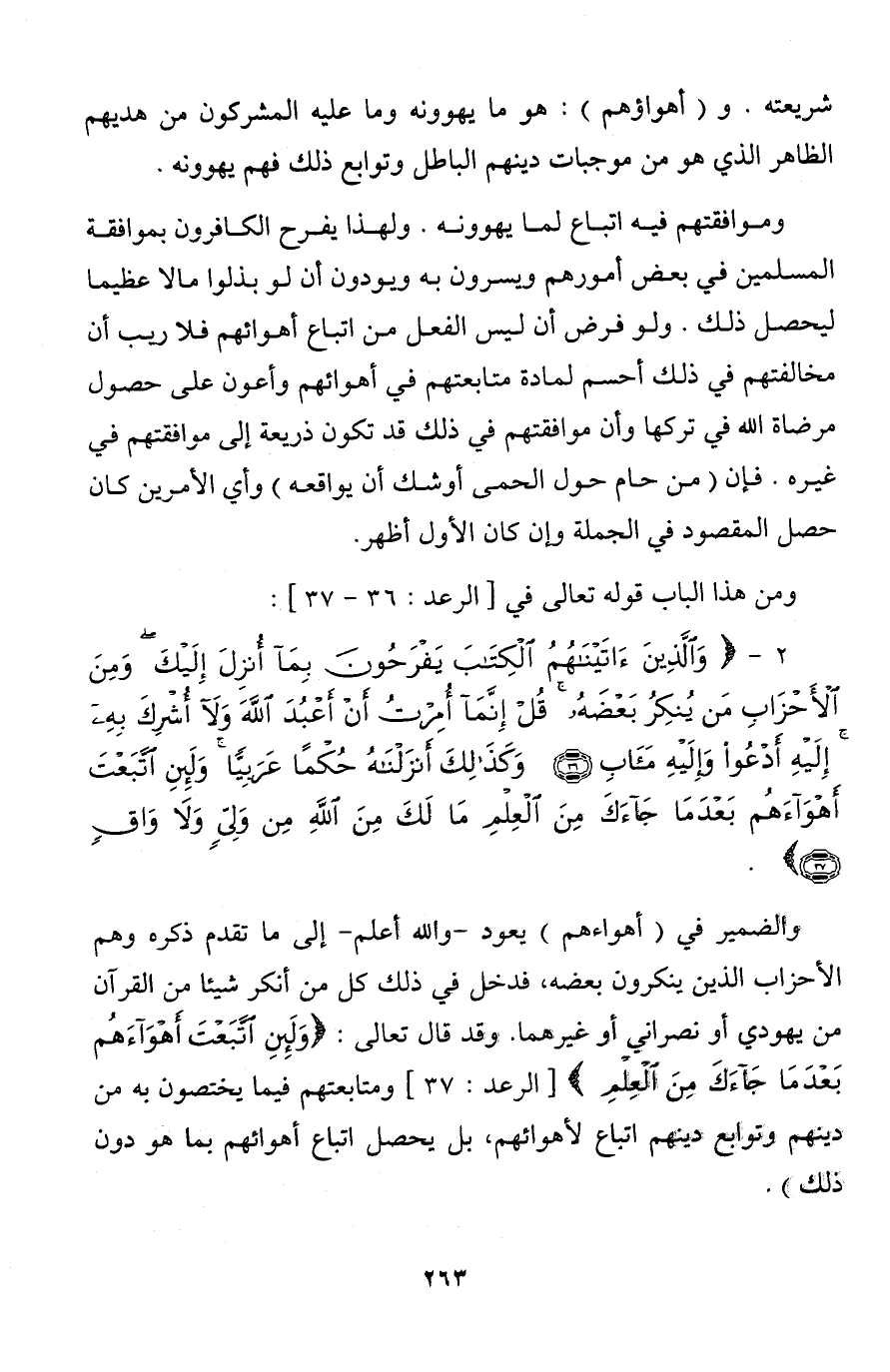 2 - {وَالَّذِينَ آتَيْنَاهُمُ الْكِتَابَ يَفْرَحُونَ بِمَا أُنْزِلَ إِلَيْكَ وَمِنَ الْأَحْزَابِ مَنْ يُنْكِرُ بَعْضَهُ قُلْ إِنَّمَا أُمِرْتُ أَنْ أَعْبُدَ اللَّهَ وَلا أُشْرِكَ بِهِ إِلَيْهِ أَدْعُو وَإِلَيْهِ مَآبِ*وَكَذَلِكَ أَنْزَلْنَاهُ حُكْماً عَرَبِيّاً وَلَئِنِ اتَّبَعْتَ أَهْوَاءَهُمْ بَعْدَ مَا جَاءَكَ مِنَ الْعِلْمِ مَا لَكَ مِنَ اللَّهِ مِنْ وَلِيٍّ وَلا وَاقٍ} والضمير في (أهواءهم) يعود -والله أعلم- إلى ما تقدم ذكره وهم الأحزاب الذين ينكرون بعضه, فدخل في ذلك كل من أنكر شيئا من القرآن من يهودي أو نصراني أو غيرهما. وقد قال تعالى: {وَلَئِنِ اتَّبَعْتَ أَهْوَاءَهُمْ بَعْدَ مَا جَاءَكَ مِنَ الْعِلْمِ} [الرعد: 37] ومتابعتهم فيما يختصون به من دينهم وتوابع دينهم اتباع لأهوائهم, بل يحصل اتباع أهوائهم بما هو دون ذلك).