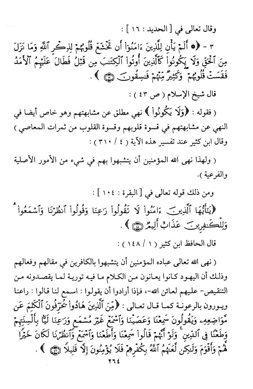 (ولهذا نهى الله المؤمنين أن يتشبهوا بهم في شيء من الأمور الأصلية والفرعية).