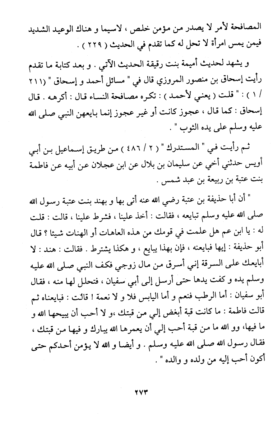 المصافحة لأمر لا يصدر من مؤمن خلص، لاسيما وهناك الوعيد الشديد فيمن يمس امرأة لا تحل له كما تقدم في الحديث (229).
