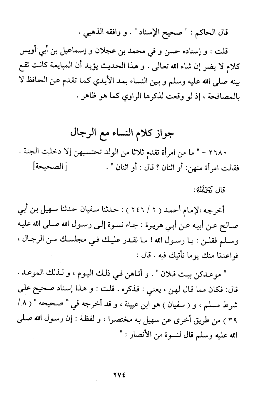2680 - " ما من امرأة تقدم ثلاثا من الولد تحتسبهن إلا دخلت الجنة. فقالت امرأة منهن: أو اثنان؟ قال: أو اثنان ". ... [الصحيحة]