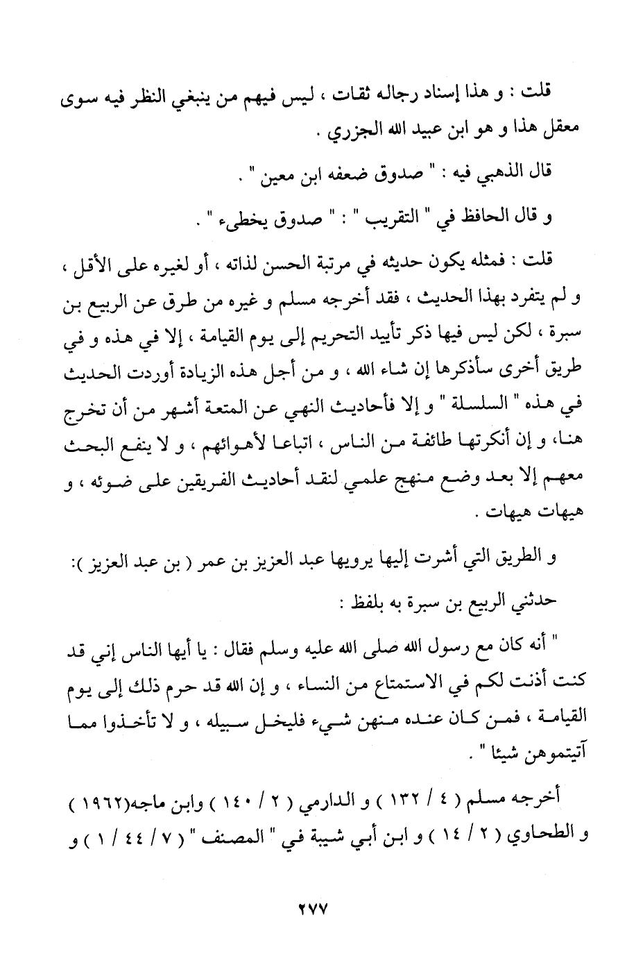 قلت: فمثله يكون حديثه في مرتبة الحسن لذاته، أو لغيره على الأقل، ولم يتفرد بهذا الحديث، فقد أخرجه مسلم وغيره من طرق عن الربيع بن سبرة، لكن ليس فيها ذكر تأييد التحريم إلى يوم القيامة، إلا في هذه وفي طريق أخرى سأذكرها إن شاء الله، ومن أجل هذه الزيادة أوردت الحديث في هذه " السلسلة " وإلا فأحاديث النهي عن المتعة أشهر من أن تخرج هنا، وإن أنكرتها طائفة من الناس، اتباعا لأهوائهم، ولا ينفع البحث معهم إلا بعد وضع منهج علمي لنقد أحاديث الفريقين على ضوئه، وهيهات هيهات.