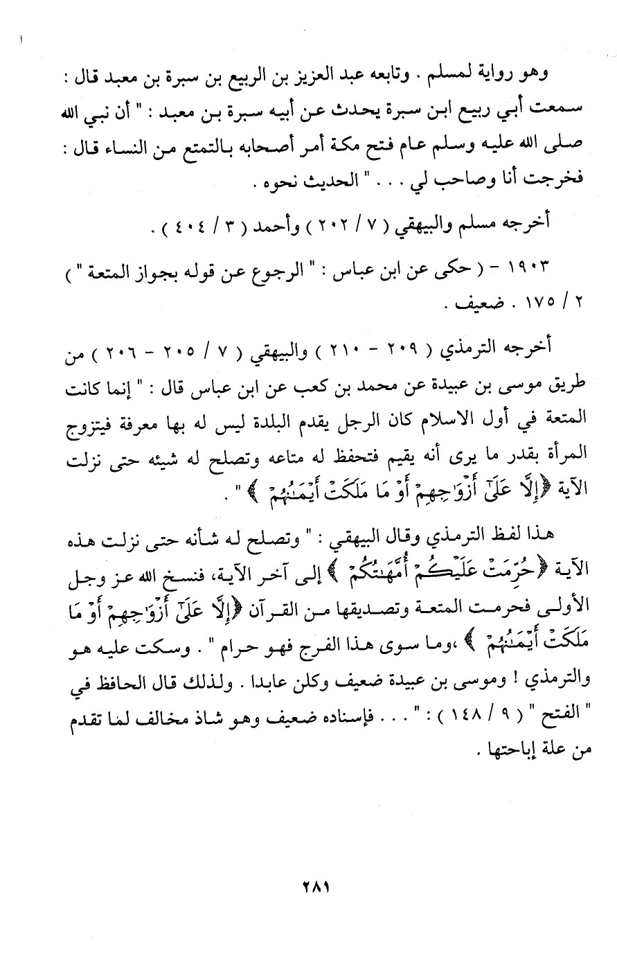 هذا لفظ الترمذي وقال البيهقي: " وتصلح له شأنه حتى نزلت هذه الآية {حُرِّمَتْ عَلَيْكُمْ أُمَّهَاتُكُمْ} إلى آخر الآية, فنسخ الله عز وجل الأولى فحرمت المتعة وتصديقها من القرآن {إِلَّا عَلَى أَزْوَاجِهِمْ أَوْ مَا مَلَكَتْ أَيْمَانُهُمْ} ,وما سوى هذا الفرج فهو حرام ". وسكت عليه هو والترمذي! وموسى بن عبيدة ضعيف وكلن عابدا. ولذلك قال الحافظ في " الفتح " (9/ 148): ". . . فإسناده ضعيف وهو شاذ مخالف لما تقدم من علة إباحتها.