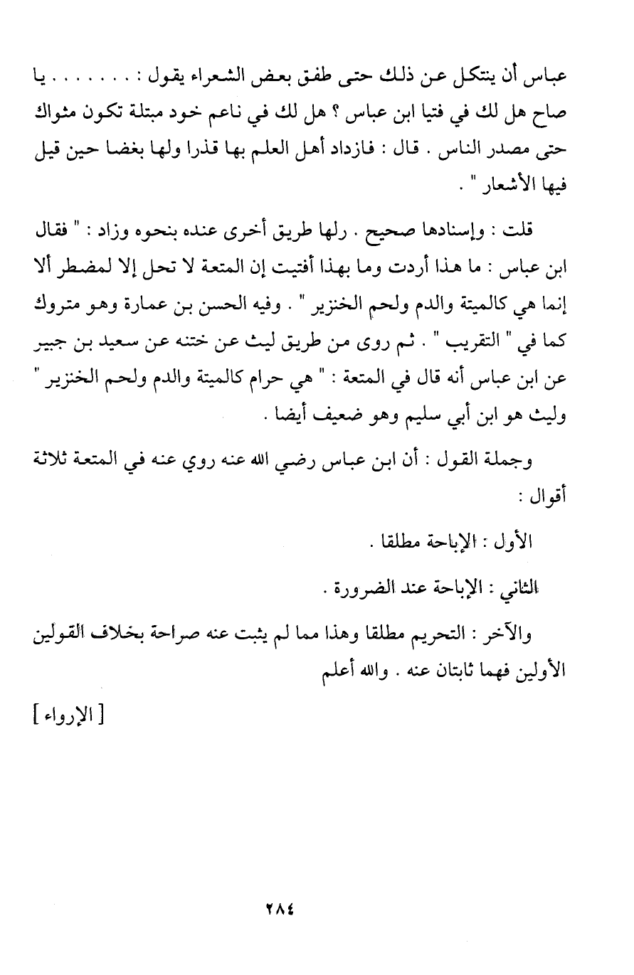 عباس أن ينتكل عن ذلك حتى طفق بعض الشعراء يقول:. . . . . . . يا صاح هل لك في فتيا ابن عباس؟ هل لك في ناعم خود مبتلة تكون مثواك حتى مصدر الناس. قال: فازداد أهل العلم بها قذرا ولها بغضا حين قيل فيها الأشعار ".