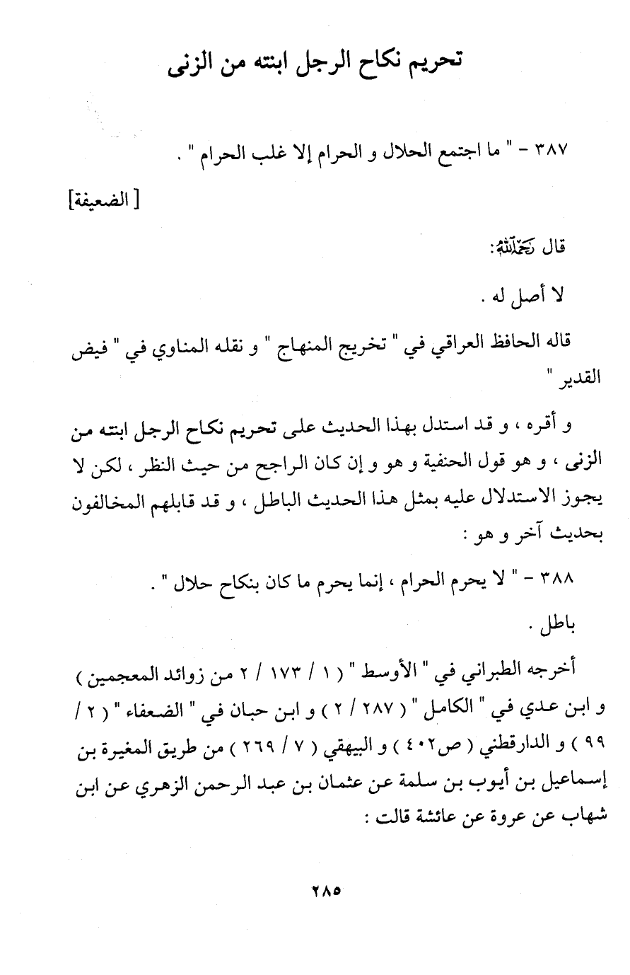 وأقره، وقد استدل بهذا الحديث على تحريم نكاح الرجل ابنته من الزنى، وهو قول الحنفية وهو وإن كان الراجح من حيث النظر، لكن لا يجوز الاستدلال عليه بمثل هذا الحديث الباطل، وقد قابلهم المخالفون بحديث آخر وهو: