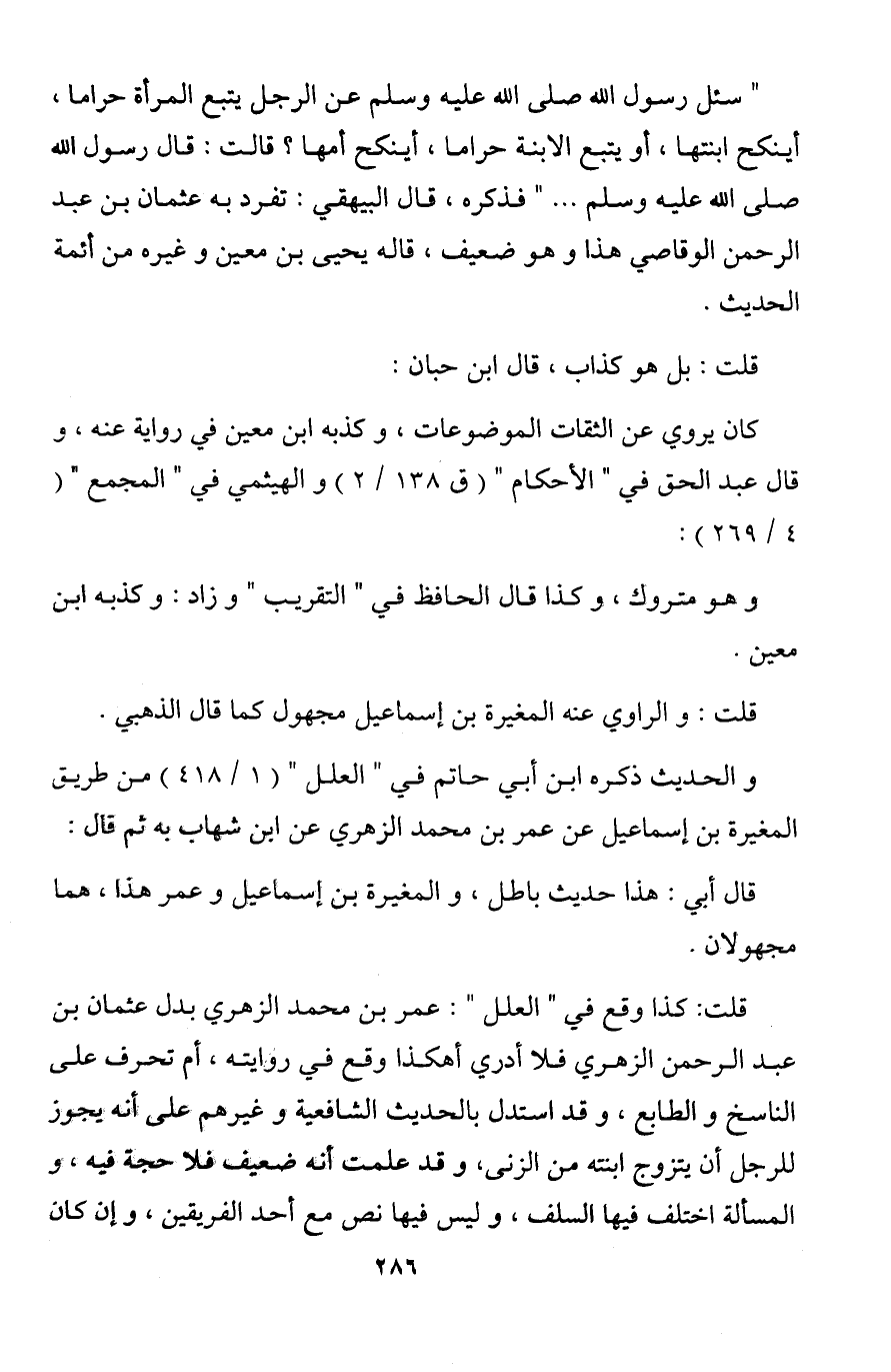 قلت: كذا وقع في " العلل ": عمر بن محمد الزهري بدل عثمان بن عبد الرحمن الزهري فلا أدري أهكذا وقع في روايته، أم تحرف على الناسخ والطابع، وقد استدل بالحديث الشافعية وغيرهم على أنه يجوز للرجل أن يتزوج ابنته من الزنى, وقد علمت أنه ضعيف فلا حجة فيه، والمسألة اختلف فيها السلف، وليس فيها نص مع أحد الفريقين، وإن كان