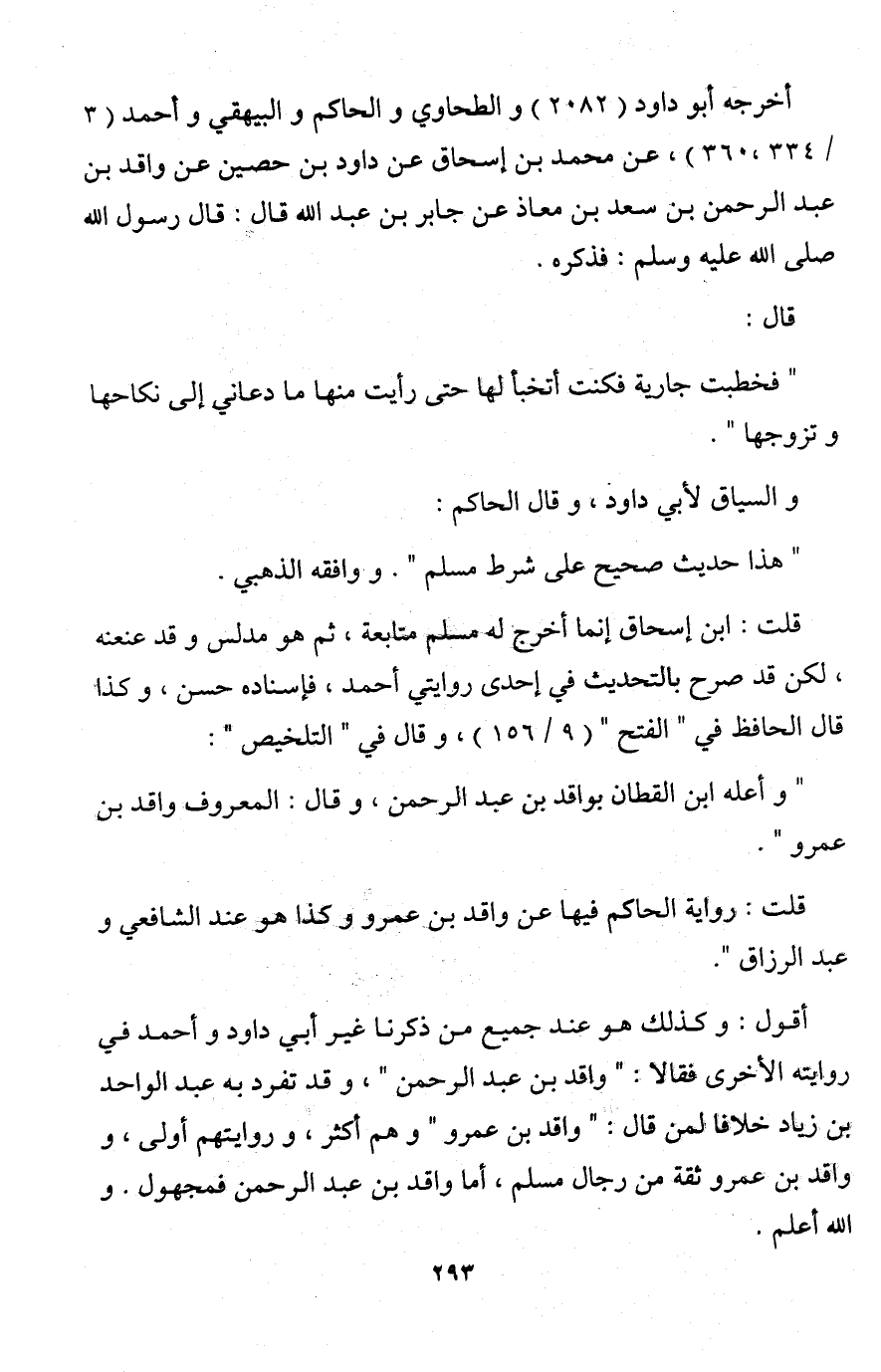 أقول: وكذلك هو عند جميع من ذكرنا غير أبي داود وأحمد في روايته الأخرى فقالا: " واقد بن عبد الرحمن "، وقد تفرد به عبد الواحد بن زياد خلافا لمن قال: " واقد بن عمرو " وهم أكثر، وروايتهم أولى، وواقد بن عمرو ثقة من رجال مسلم، أما واقد بن عبد الرحمن فمجهول. والله أعلم.