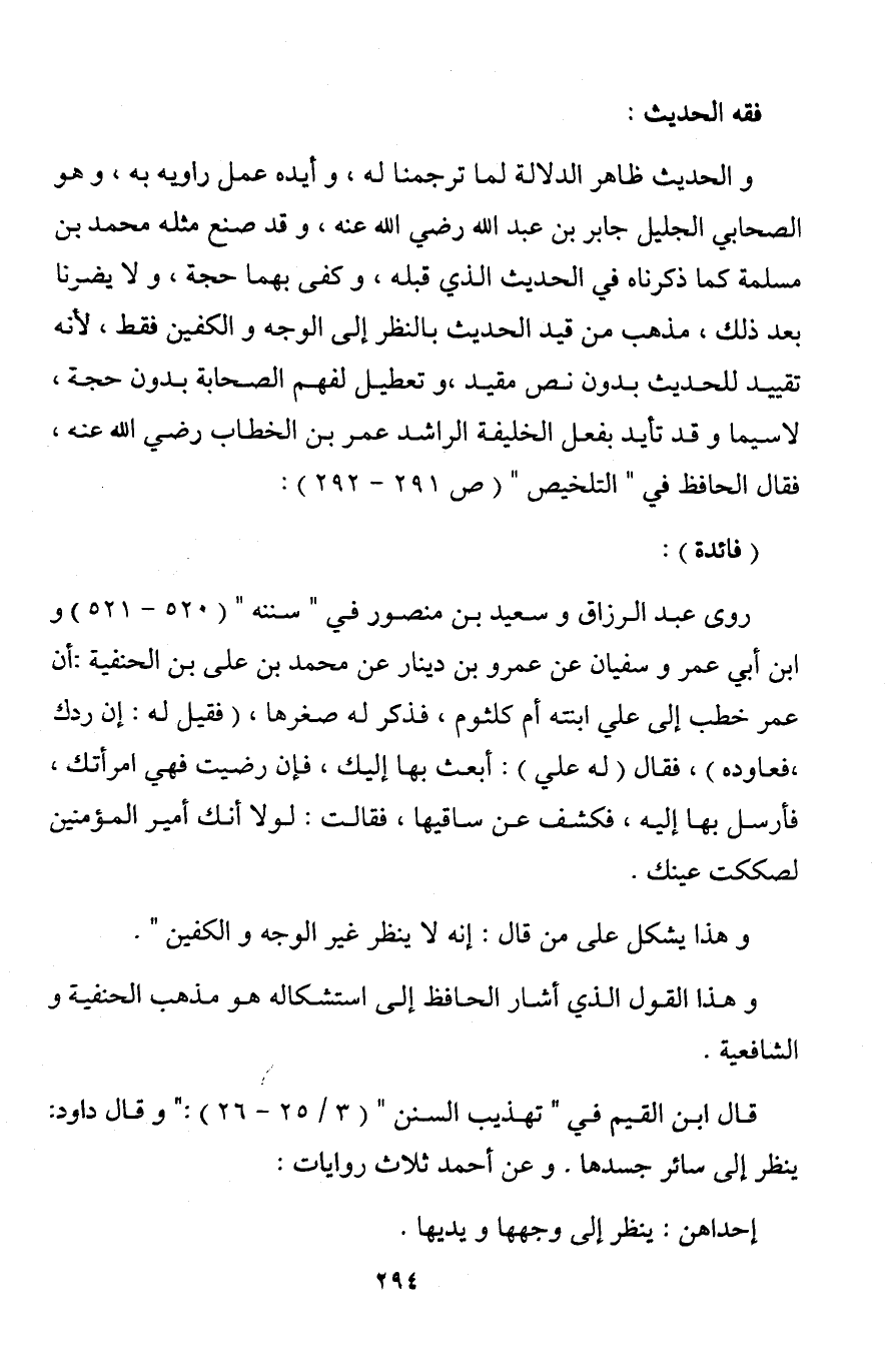 والحديث ظاهر الدلالة لما ترجمنا له، وأيده عمل راويه به، وهو الصحابي الجليل جابر بن عبد الله رضي الله عنه، وقد صنع مثله محمد بن مسلمة كما ذكرناه في الحديث الذي قبله، وكفى بهما حجة، ولا يضرنا بعد ذلك، مذهب من قيد الحديث بالنظر إلى الوجه والكفين فقط، لأنه تقييد للحديث بدون نص مقيد، وتعطيل لفهم الصحابة بدون حجة، لاسيما وقد تأيد بفعل الخليفة الراشد عمر بن الخطاب رضي الله عنه، فقال الحافظ في " التلخيص " (ص 291 - 292):