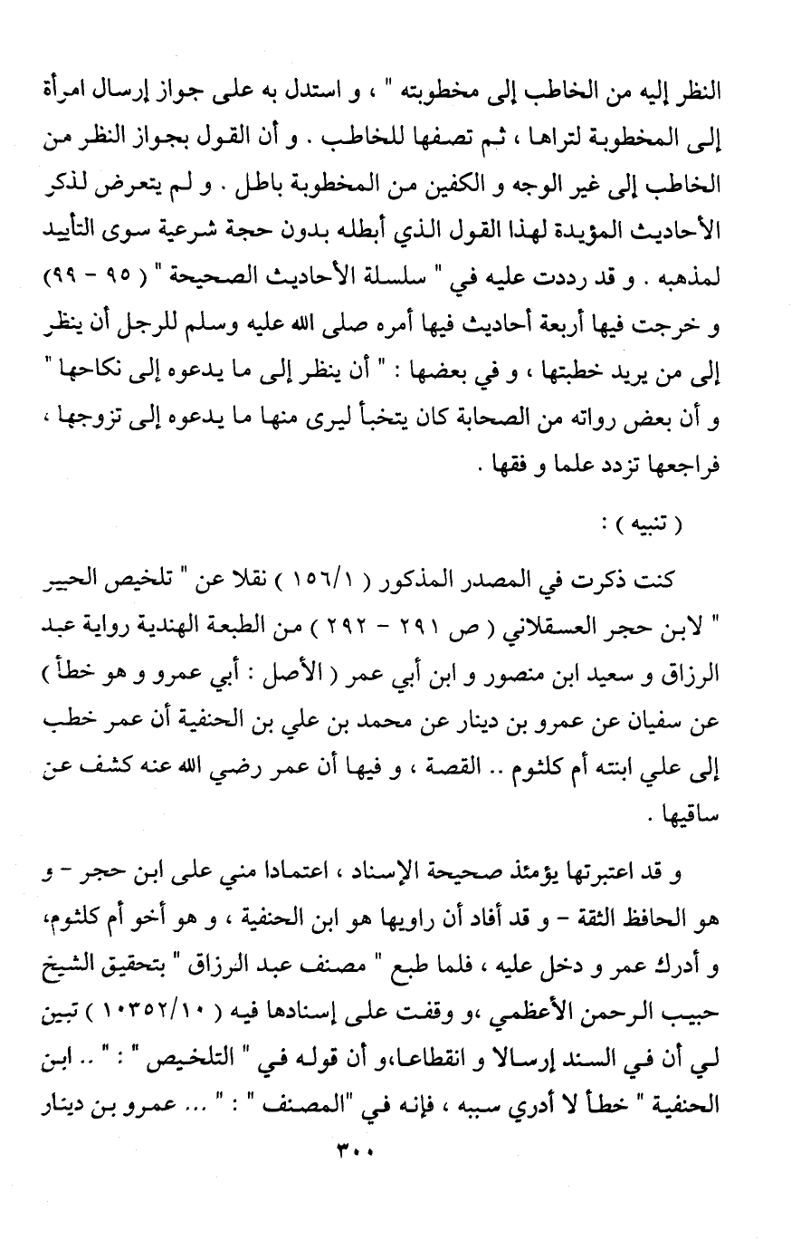 النظر إليه من الخاطب إلى مخطوبته "، واستدل به على جواز إرسال امرأة إلى المخطوبة لتراها، ثم تصفها للخاطب. وأن القول بجواز النظر من الخاطب إلى غير الوجه والكفين من المخطوبة باطل. ولم يتعرض لذكر الأحاديث المؤيدة لهذا القول الذي أبطله بدون حجة شرعية سوى التأييد لمذهبه. وقد رددت عليه في " سلسلة الأحاديث الصحيحة " (95 - 99) وخرجت فيها أربعة أحاديث فيها أمره صلى الله عليه وسلم للرجل أن ينظر إلى من يريد خطبتها، وفي بعضها: " أن ينظر إلى ما يدعوه إلى نكاحها " وأن بعض رواته من الصحابة كان يتخبأ ليرى منها ما يدعوه إلى تزوجها، فراجعها تزدد علما وفقها.