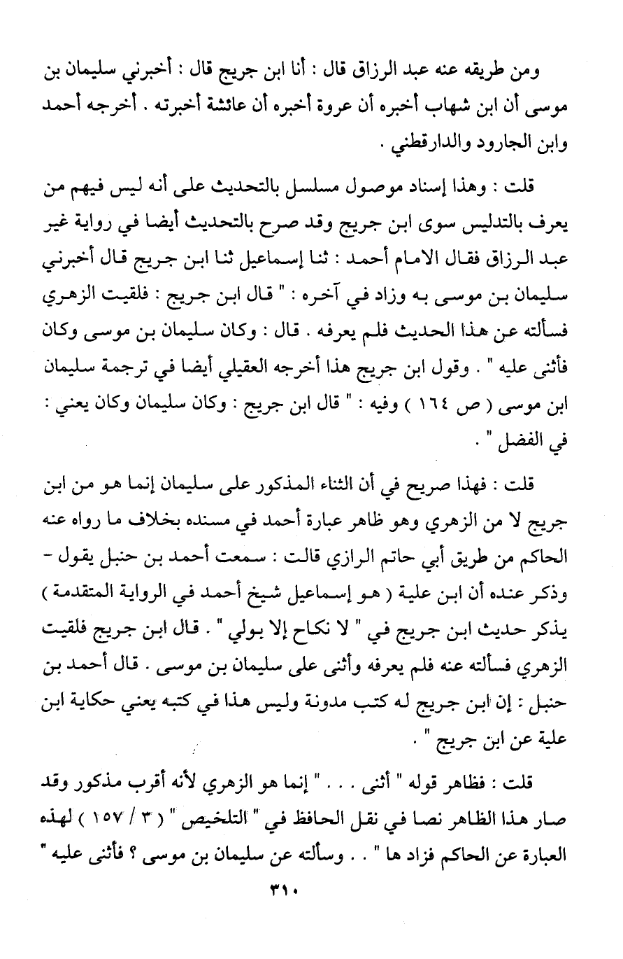 قلت: فهذا صريح في أن الثناء المذكور على سليمان إنما هو من ابن جريج لا من الزهري وهو ظاهر عبارة أحمد في مسنده بخلاف ما رواه عنه الحاكم من طريق أبي حاتم الرازي قالت: سمعت أحمد بن حنبل يقول - وذكر عنده أن ابن علية (هو إسماعيل شيخ أحمد في الرواية المتقدمة) يذكر حديث ابن جريج في " لا نكاح إلا بولي ". قال ابن جريج فلقيت الزهري فسألته عنه فلم يعرفه وأثنى على سليمان بن موسى. قال أحمد بن حنبل: إن ابن جريج له كتب مدونة وليس هذا في كتبه يعني حكاية ابن علية عن ابن جريج ".