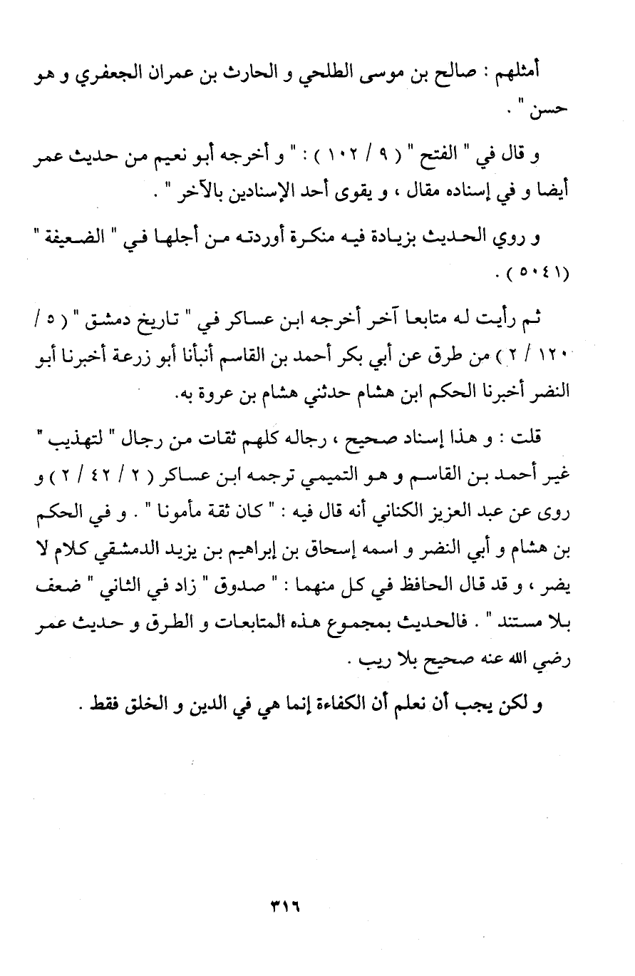 قلت: وهذا إسناد صحيح، رجاله كلهم ثقات من رجال " لتهذيب " غير أحمد بن القاسم وهو التميمي ترجمه ابن عساكر (2/ 42 / 2) وروى عن عبد العزيز الكناني أنه قال فيه: " كان ثقة مأمونا ". وفي الحكم بن هشام وأبي النضر واسمه إسحاق بن إبراهيم بن يزيد الدمشقي كلام لا يضر، وقد قال الحافظ في كل منهما: " صدوق " زاد في الثاني " ضعف بلا مستند ". فالحديث بمجموع هذه المتابعات والطرق وحديث عمر رضي الله عنه صحيح بلا ريب.