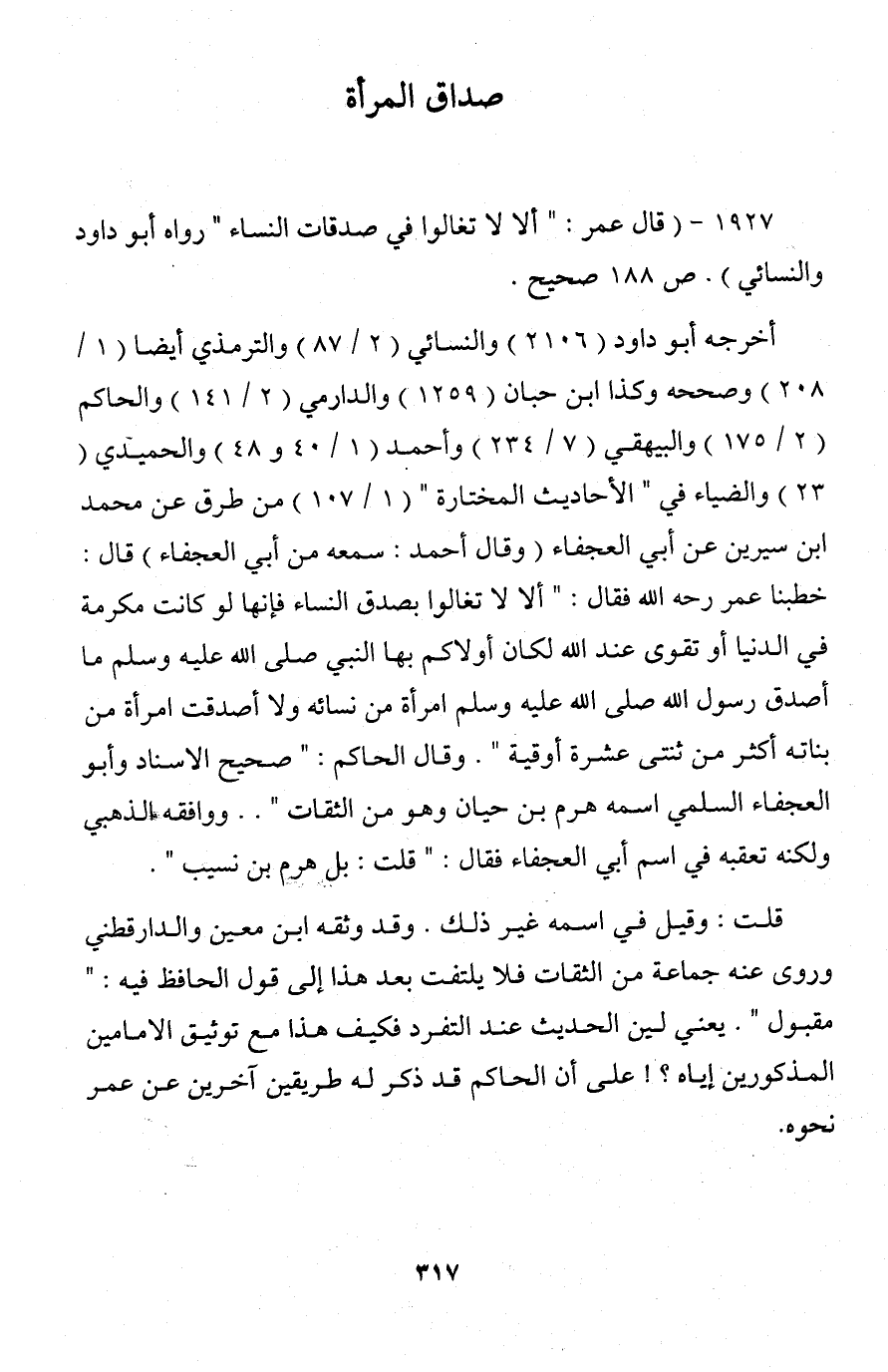 1927 - (قال عمر: " ألا لا تغالوا في صدقات النساء " رواه أبو داود والنسائي). ص 188 صحيح.