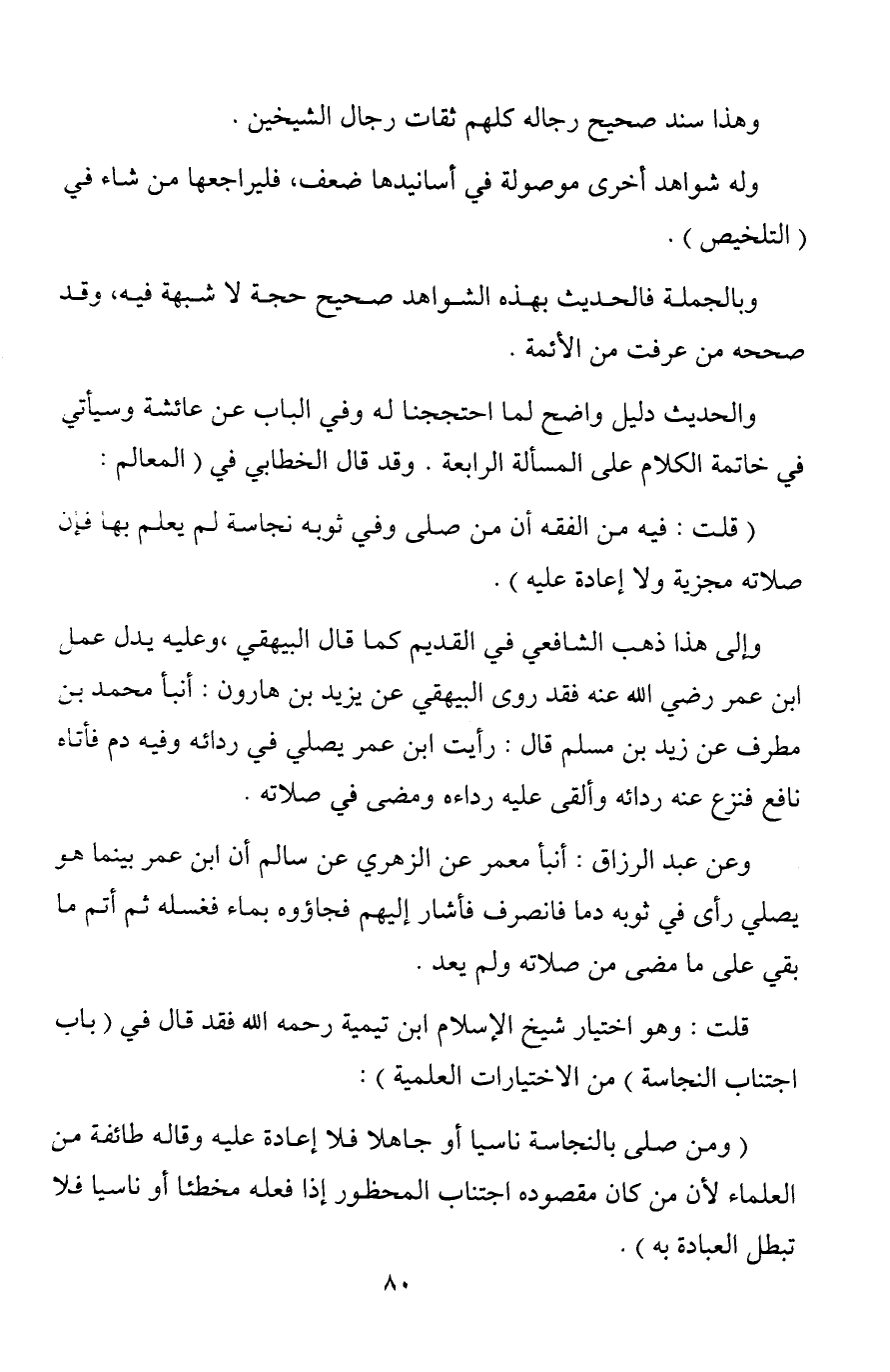 وإلى هذا ذهب الشافعي في القديم كما قال البيهقي ,وعليه يدل عمل ابن عمر رضي الله عنه فقد روى البيهقي عن يزيد بن هارون: أنبأ محمد بن مطرف عن زيد بن مسلم قال: رأيت ابن عمر يصلي في ردائه وفيه دم فأتاه نافع فنزع عنه ردائه وألقى عليه رداءه ومضى في صلاته.
