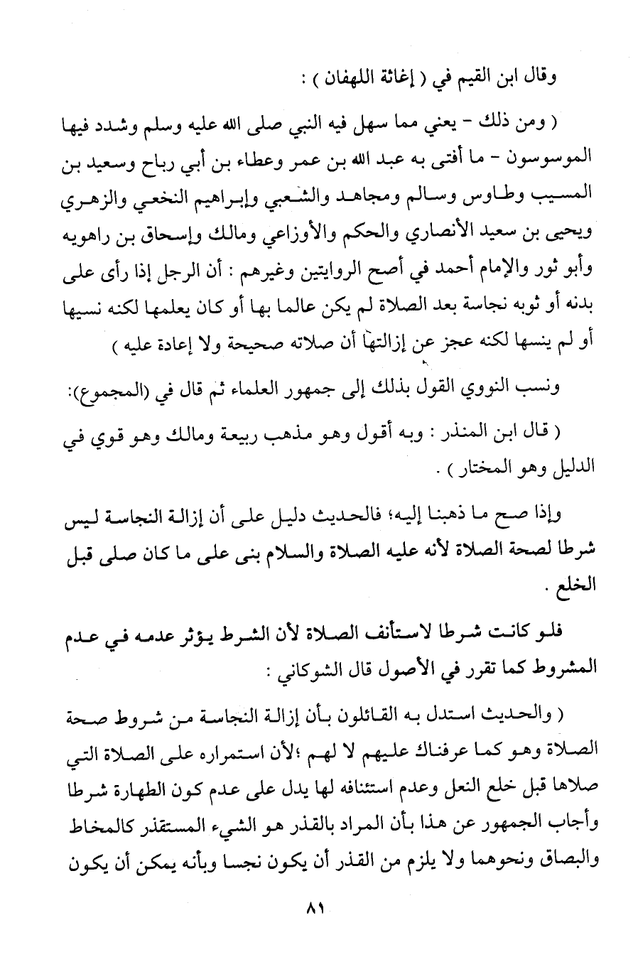 (ومن ذلك - يعني مما سهل فيه النبي صلى الله عليه وسلم وشدد فيها الموسوسون - ما أفتى به عبد الله بن عمر وعطاء بن أبي رباح وسعيد بن المسيب وطاوس وسالم ومجاهد والشعبي وإبراهيم النخعي والزهري ويحيى بن سعيد الأنصاري والحكم والأوزاعي ومالك وإسحاق بن راهويه وأبو ثور والإمام أحمد في أصح الروايتين وغيرهم: أن الرجل إذا رأى على بدنه أو ثوبه نجاسة بعد الصلاة لم يكن عالما بها أو كان يعلمها لكنه نسيها أو لم ينسها لكنه عجز عن إزالتها أن صلاته صحيحة ولا إعادة عليه)