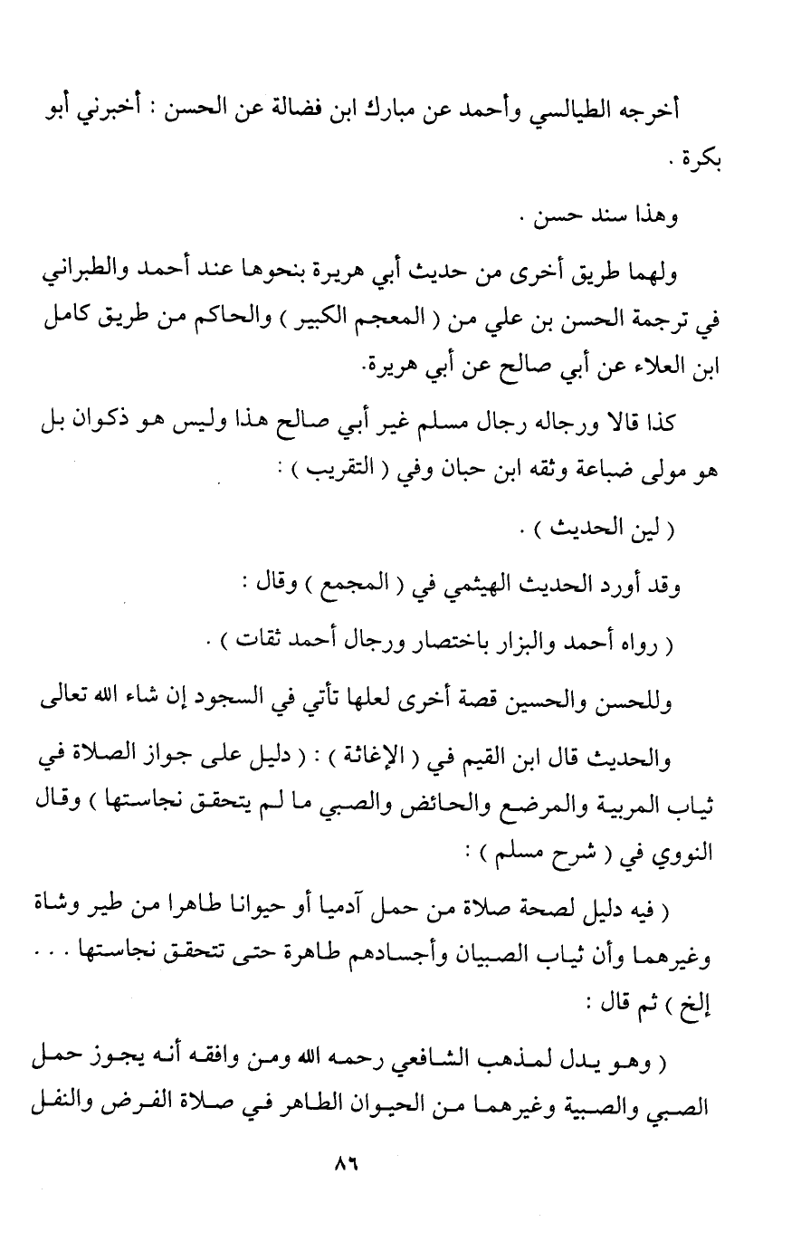 والحديث قال ابن القيم في (الإغاثة): (دليل على جواز الصلاة في ثياب المربية والمرضع والحائض والصبي ما لم يتحقق نجاستها) وقال النووي في (شرح مسلم):