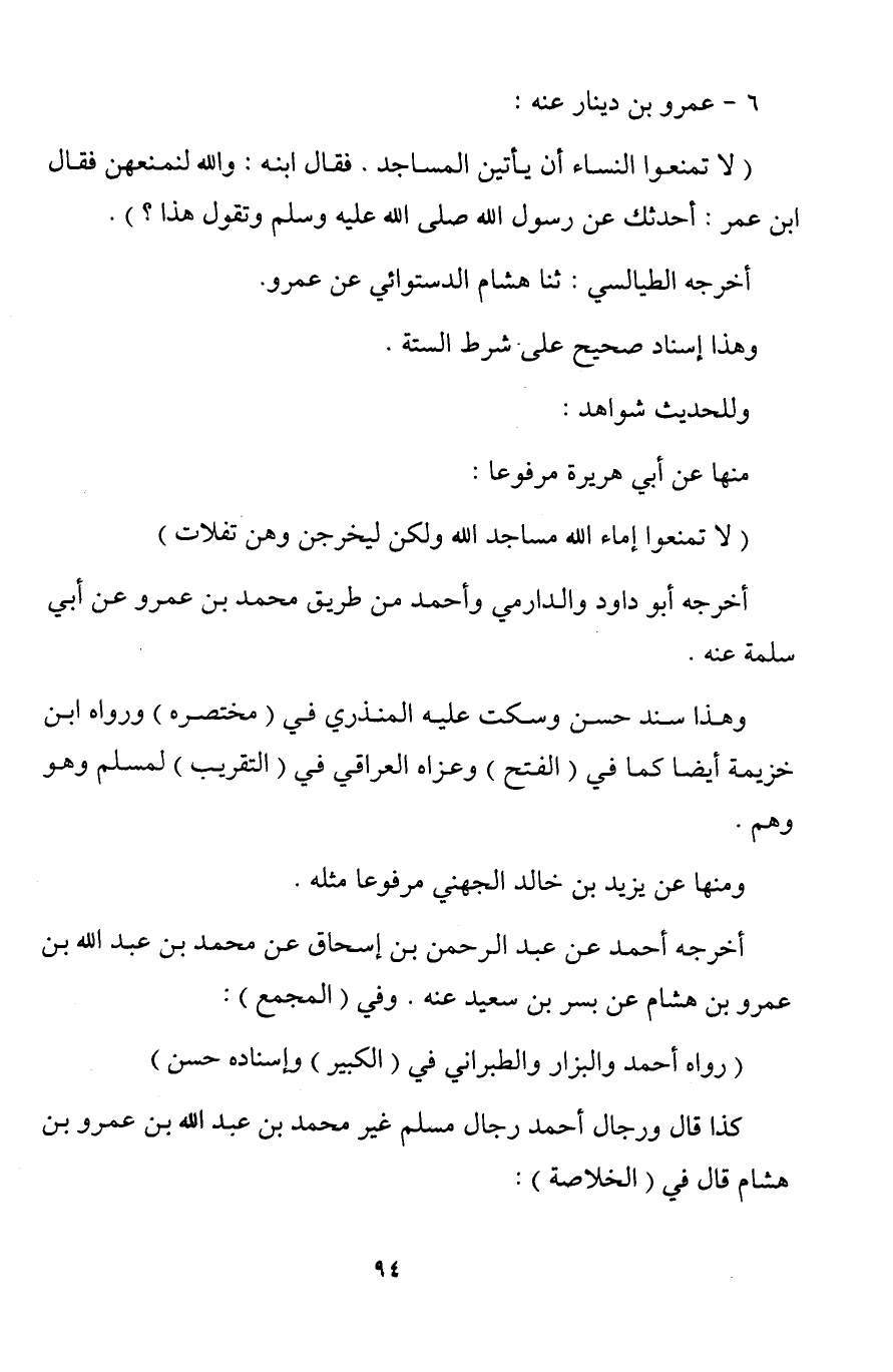 (لا تمنعوا النساء أن يأتين المساجد. فقال ابنه: والله لنمنعهن فقال ابن عمر: أحدثك عن رسول الله صلى الله عليه وسلم وتقول هذا؟).
