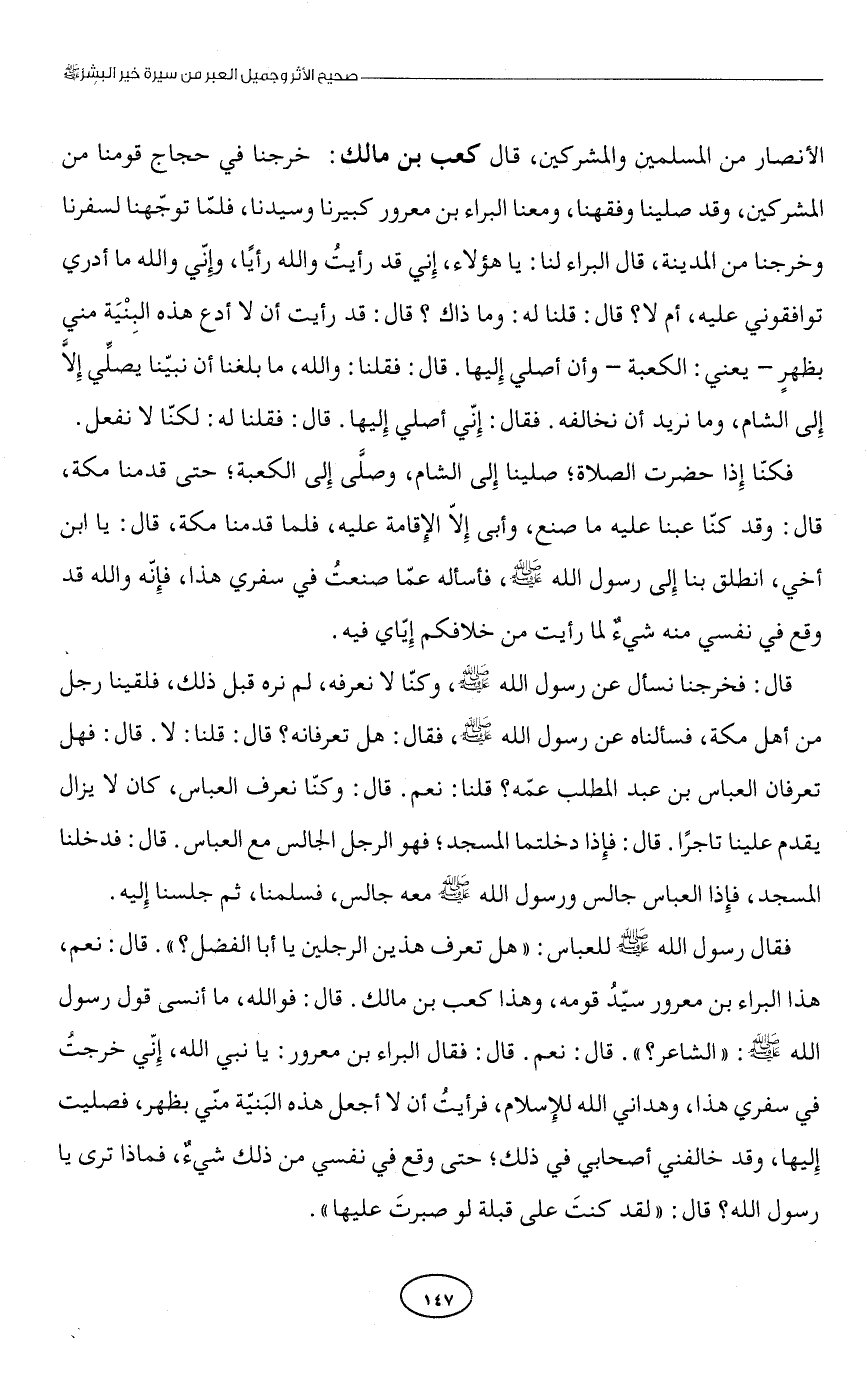 فقال رسول الله - صلى الله عليه وسلم - للعباس: "هل تعرف هذين الرجلين يا أبا الفضل؟ ". قال: نعم، هذا البراء بن معرور سيّدُ قومه، وهذا كعب بن مالك. قال: فوالله، ما أنسى قول رسول الله - صلى الله عليه وسلم -: "الشاعر؟ ". قال: نعم. قال: فقال البراء بن معرور: يا نبي الله، إِنّي خرجتُ في سفري هذا، وهداني الله للإِسلام، فرأيتُ أن لا أجعل هذه البَنيّة منّي بظهر، فصليت إِليها، وقد خالفني أصحابي في ذلك؛ حتى وقع في نفسي من ذلك شيءٌ، فماذا ترى يا رسول الله؟ قال: "لقد كنتَ على قبلة لو صبرتَ عليها".