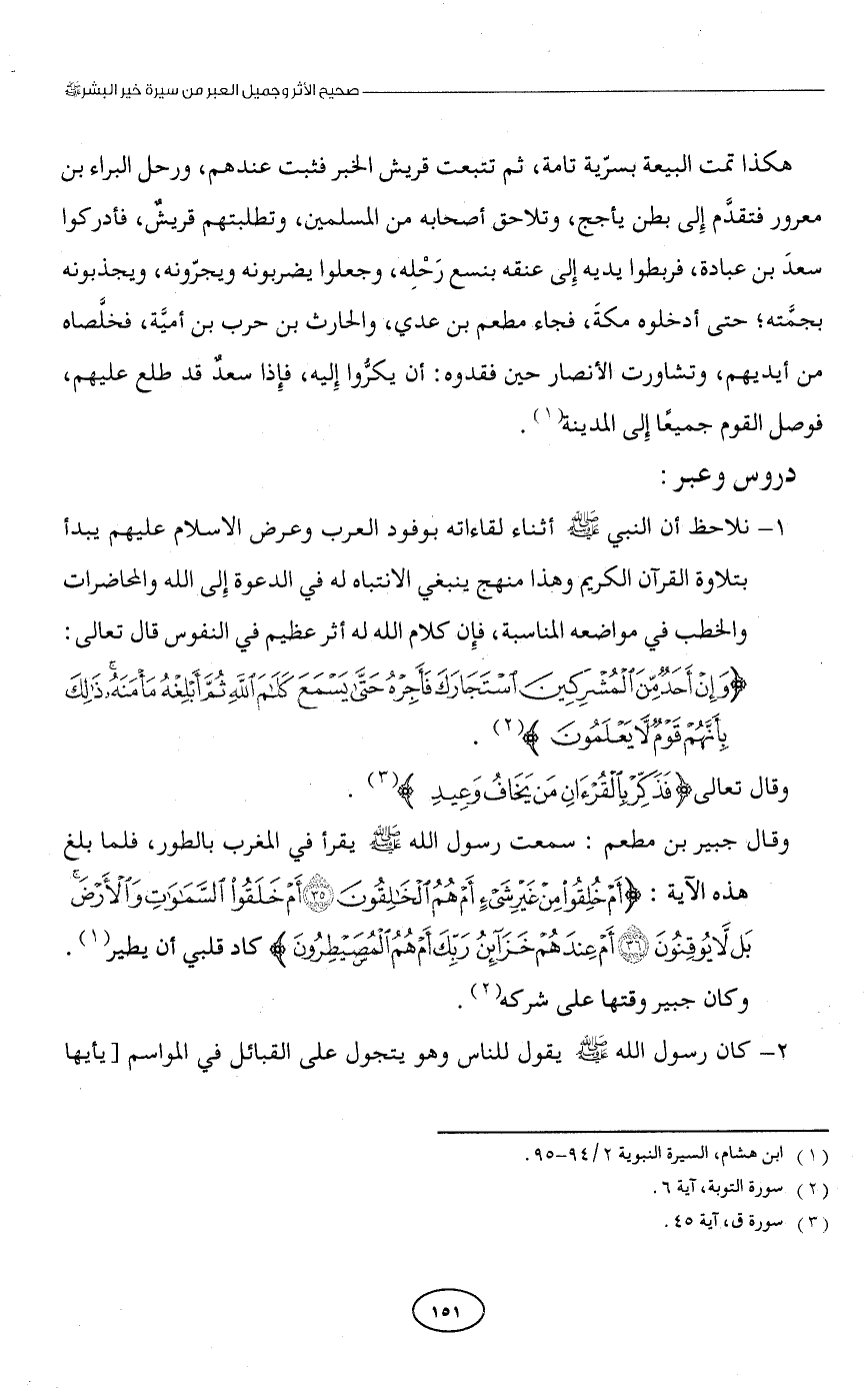 1 - نلاحظ أن النبي - صلى الله عليه وسلم - أثناء لقاءاته بوفود العرب وعرض الإِسلام عليهم يبدأ بتلاوة القرآن الكريم وهذا منهج ينبغي الانتباه له في الدعوة إِلى الله والمحاضرات والخطب في مواضعه المناسبة، فإِن كلام الله له أثر عظيم في النفوس قال تعالى:
