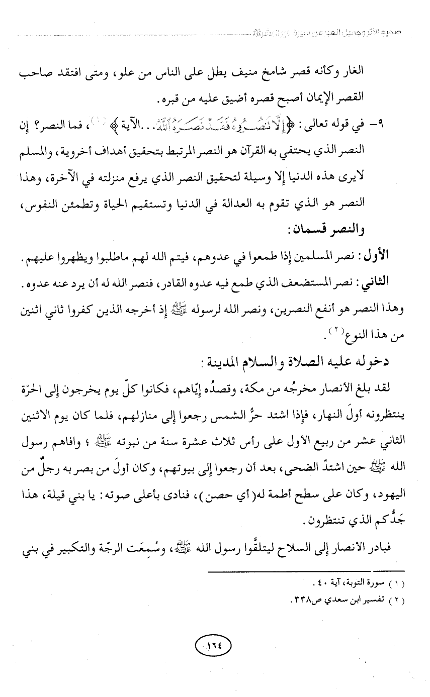 9 - في قوله تعالى: {إِلَّا تَنْصُرُوهُ فَقَدْ نَصَرَهُ اللَّهُ .... الآية} (¬1)، فما النصر؟ إِن النصر الذي يحتفي به القرآن هو النصر المرتبط بتحقيق أهداف أخروية، والمسلم لا يرى هذه الدنيا إِلا وسيلة لتحقيق النصر الذي يرفع منزلته في الآخرة، وهذا النصر هو الذي تقوم به العدالة في الدنيا وتستقيم الحياة وتطمئن النفوس، والنصر قسمان: