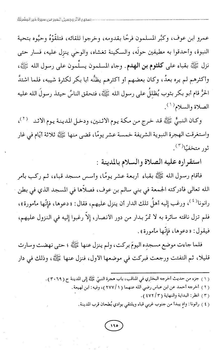 عمرو ابن عوف، وكبَّر المسلمون فرحًا بقدومه، وخرجوا للقائه، فتلقّوْهُ وحيَّوه بتحية النبوة، وأحدقوا به مطيفين حولَه، والسكينة تغشاه، والوحي ينزِل عليه، فسار حتى نزل - صلى الله عليه وسلم - بقباء على كلثوم بن الهدم. وجاء المسلمون يسلِّمون على رسول الله -صلى الله عليه وسلم -، وأكثرهم لم يره بعدُ، وكان بعضهم أو أكثرهم يظنُّه أبا بكر لكثرة شيبة، فلما اشتدَّ الحرُّ قام أبو بكر بثوب يُظلِلُ على رسول الله - صلى الله عليه وسلم -، فتحقق الناسُ حينئذ رسولَ الله عليه الصلاة والسلام (¬1).