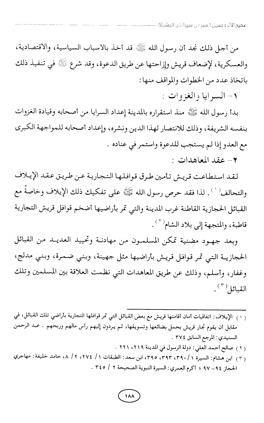 (¬1) الإِيلاف: اتفاقيات أمان أقامتها قريش مع بعض القبائل التي تمر قوافلها التجارية بأراضي تلك القبائل، في مقابل أن يقوم تجار قريش بحمل بضائعها وتسويقها، ثم يردون إِليهم رأس مالهم وربحهم. عبد الرحمن السنيدي: المرجع السابق 374.