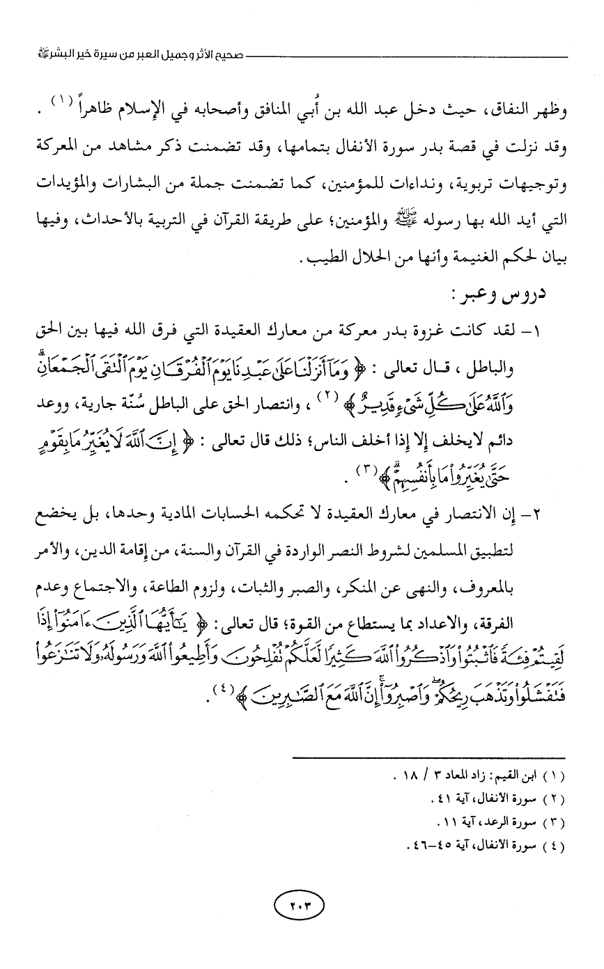 1 - لقد كانت غزوة بدر معركة من معارك العقيدة التي فرق الله فيها بين الحق والباطل، قال تعالى: {وَمَا أَنْزَلْنَا عَلَى عَبْدِنَا يَوْمَ الْفُرْقَانِ يَوْمَ الْتَقَى الْجَمْعَانِ وَاللَّهُ عَلَى كُلِّ شَيْءٍ قَدِيرٌ} (¬2)، وانتصار الحق على الباطل سُنّة جارية، ووعد دائم لا يخلف إِلا إِذا أخلف الناس؛ ذلك قال تعالى: {إِنَّ اللَّهَ لَا يُغَيِّرُ مَا بِقَوْمٍ حَتَّى يُغَيِّرُوا مَا بِأَنْفُسِهِمْ} (¬3).