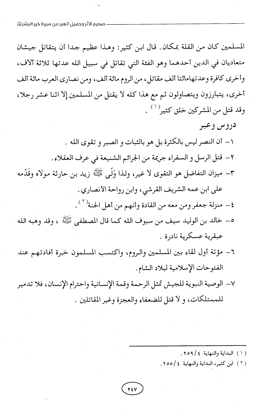 المسلمين كان من القلة بمكان. قال ابن كثير: وهذا عظيم جدًا أن يتقاتل جيشان متعاديان في الدين أحدهما وهو الفئة التي تقاتل في سبيل الله عدتها ثلاثة آلاف، وأخرى كافرة وعدتها مائتا ألف مقاتل، من الروم مائة ألف، ومن نصارى العرب مائة ألف أخرى، يتبارزون ويتصاولون ثم مع هذا كله لا يقتل من المسلمين إِلا اثنا عشر رجلًا، وقد قتل من المشركين خلق كثير (¬1).